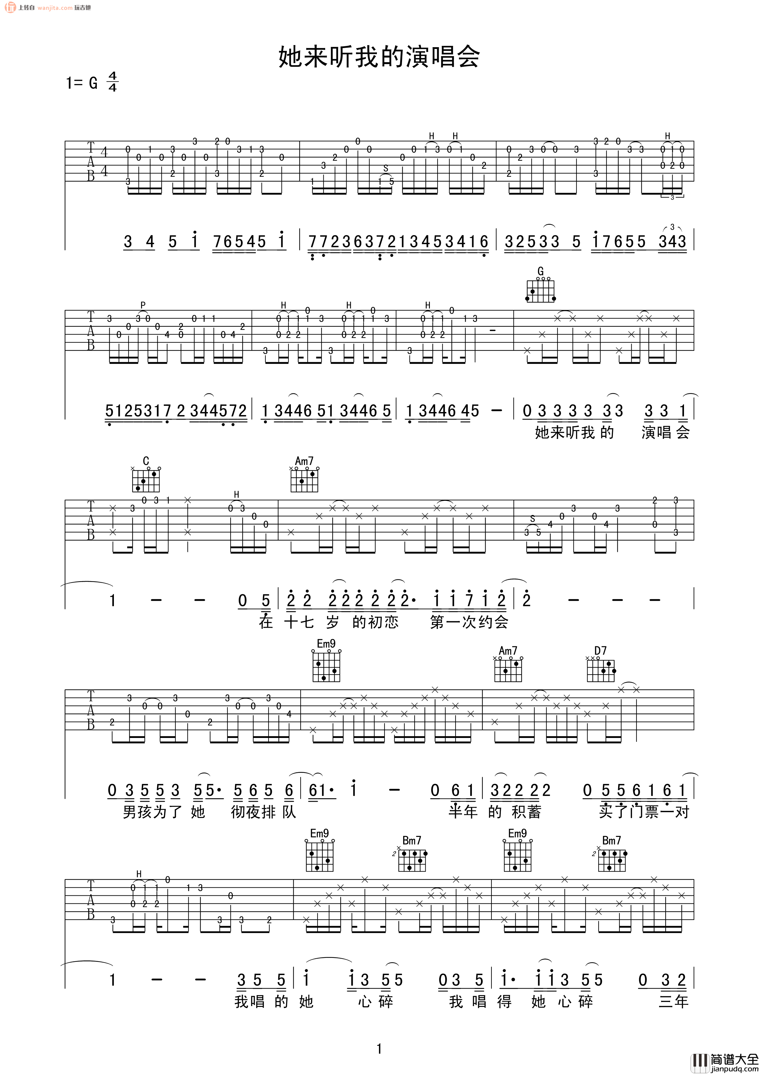 《她来听我的演唱会》吉他谱,原调G调,不使用变调夹。舒缓的前奏带给人经典的享受,吉他弹唱使这首歌曲更富感染力,难度适中的歌曲适合新手学习练习,大家练习的时候要多多注意前奏。