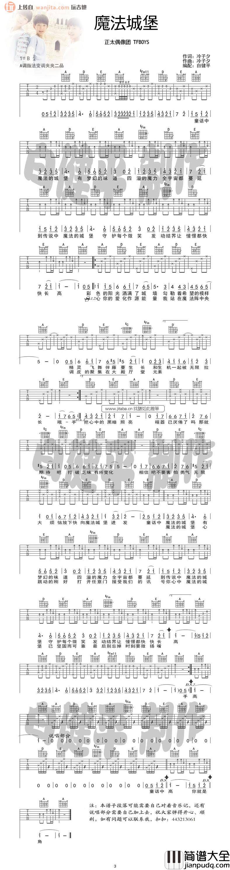 TFBOYS演唱的魔法城堡吉他谱,总共一张图片谱,这个版本选用B调,使用A调指法弹唱,变调夹夹在第二品位置处。另外,本谱子可能需要自己对着音乐记,还有说唱部分需要自己加上去。歌曲用魔法般的童话世界描绘,能让很多童真的孩童喜欢这梦幻的感觉。