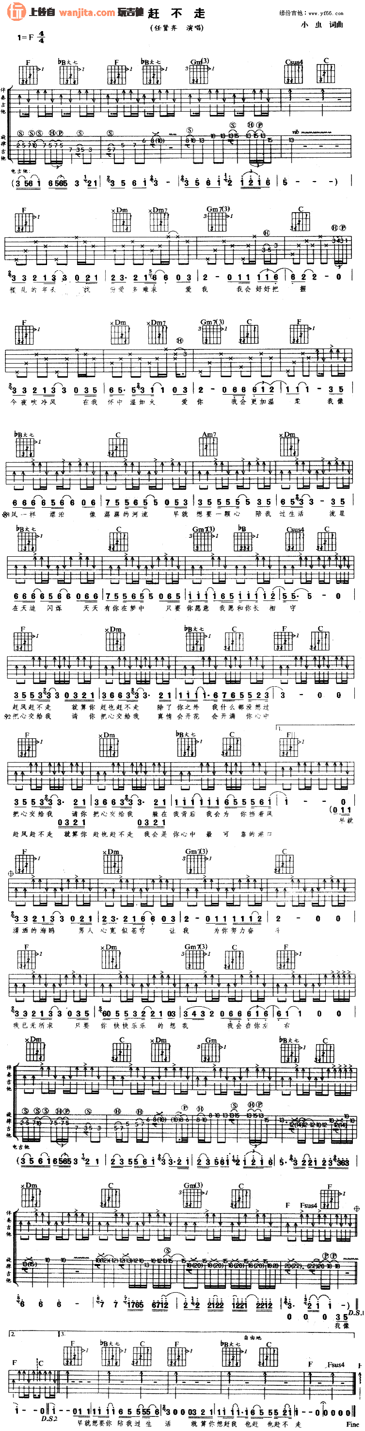 任贤齐《赶不走》吉他谱,总共1张高清图片谱,选用F调指法,节拍4/4拍,不使用变调夹,弹唱难度初级。
