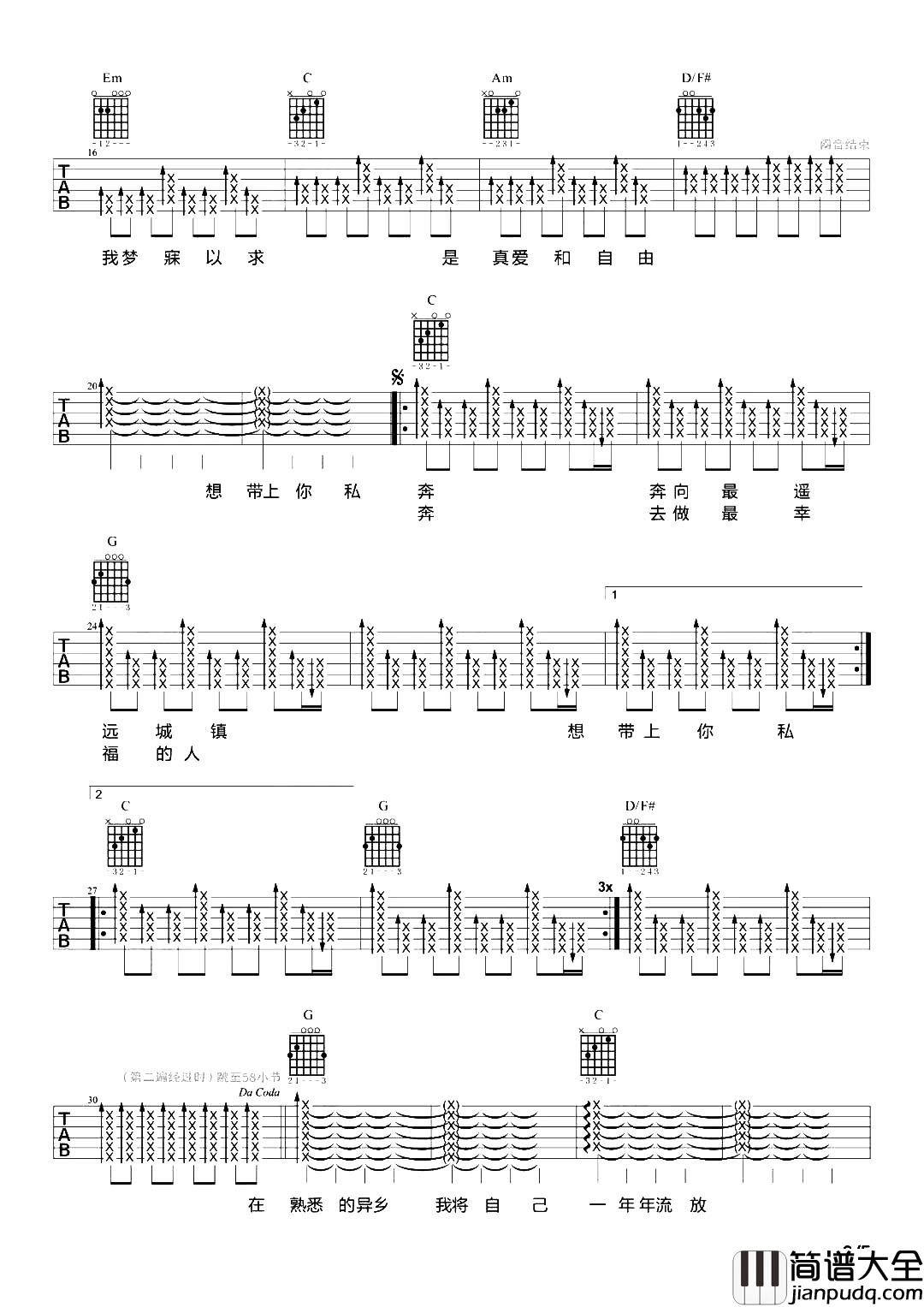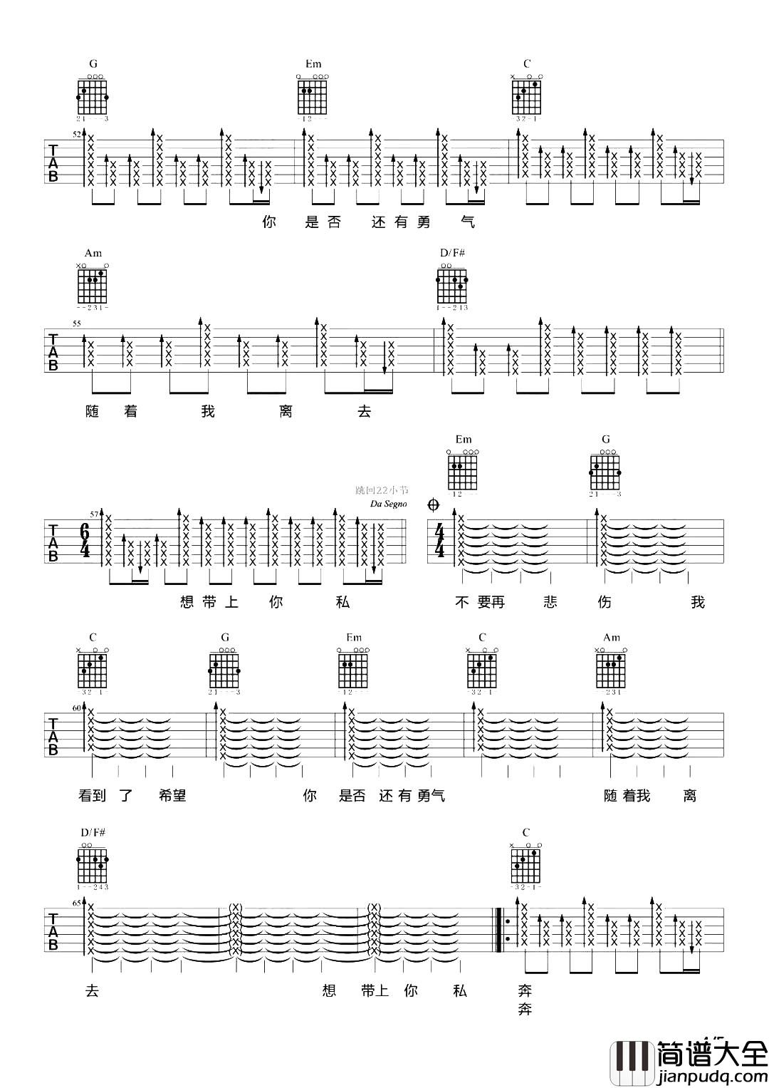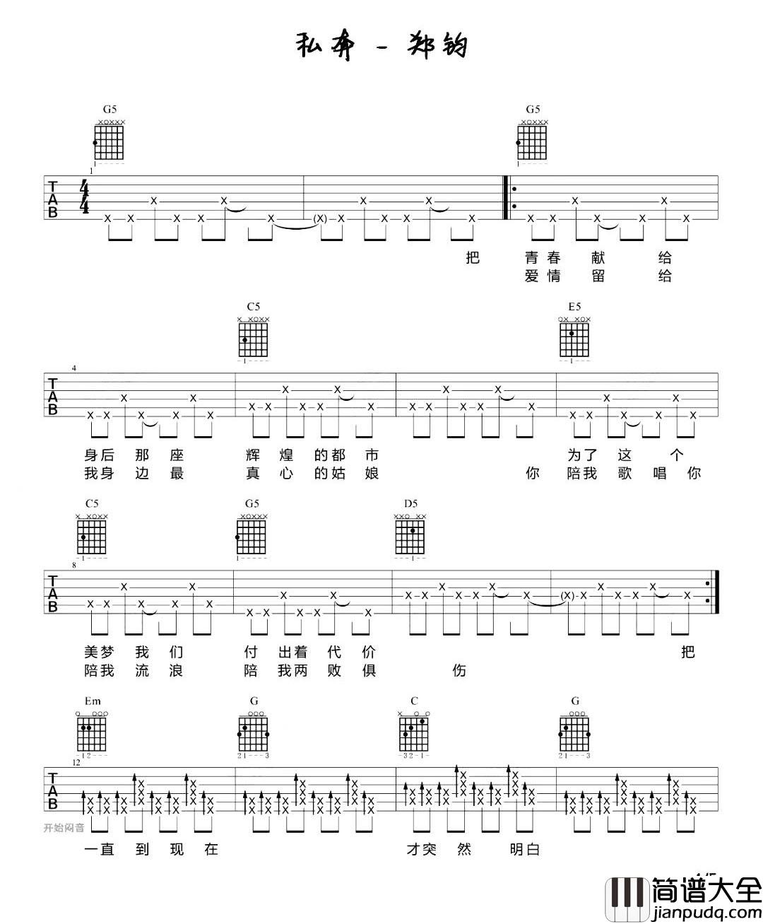 公众号:绵羊乐谱 《私奔》吉他弹唱演示视频 私奔吉他弹唱谱,总共5张高清图片谱例,由南音吉他小屋制谱分享。男生变调夹推荐夹2品,女生夹4品。左手和弦非常简单,右手用到四种伴奏手法增加层次感,也都不难,适合新手学习的一首歌曲。 公众号:绵羊乐谱 | 官方QQ群:978773290 不吃独食,学会分享!本文链接:http://www.shaomingyang.com/btb/32003.html 转载请标明出处,尊重原创(๑╹◡╹)ノ。如信息有误或版权疑问,请通过网站底部联系我们会第一时间处理,感谢理解支持(◕ᴗ◕✿)!