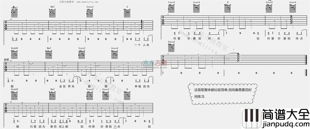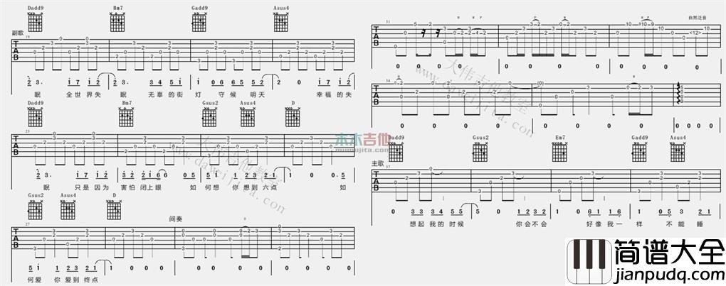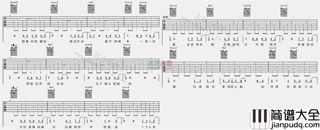 《全世界失眠》吉他谱原调D调,不使用变调夹。这首很有深意的歌曲在曲谱上同样值得学习和练习,难度属于中等,适合进阶练习学习的一首歌曲。