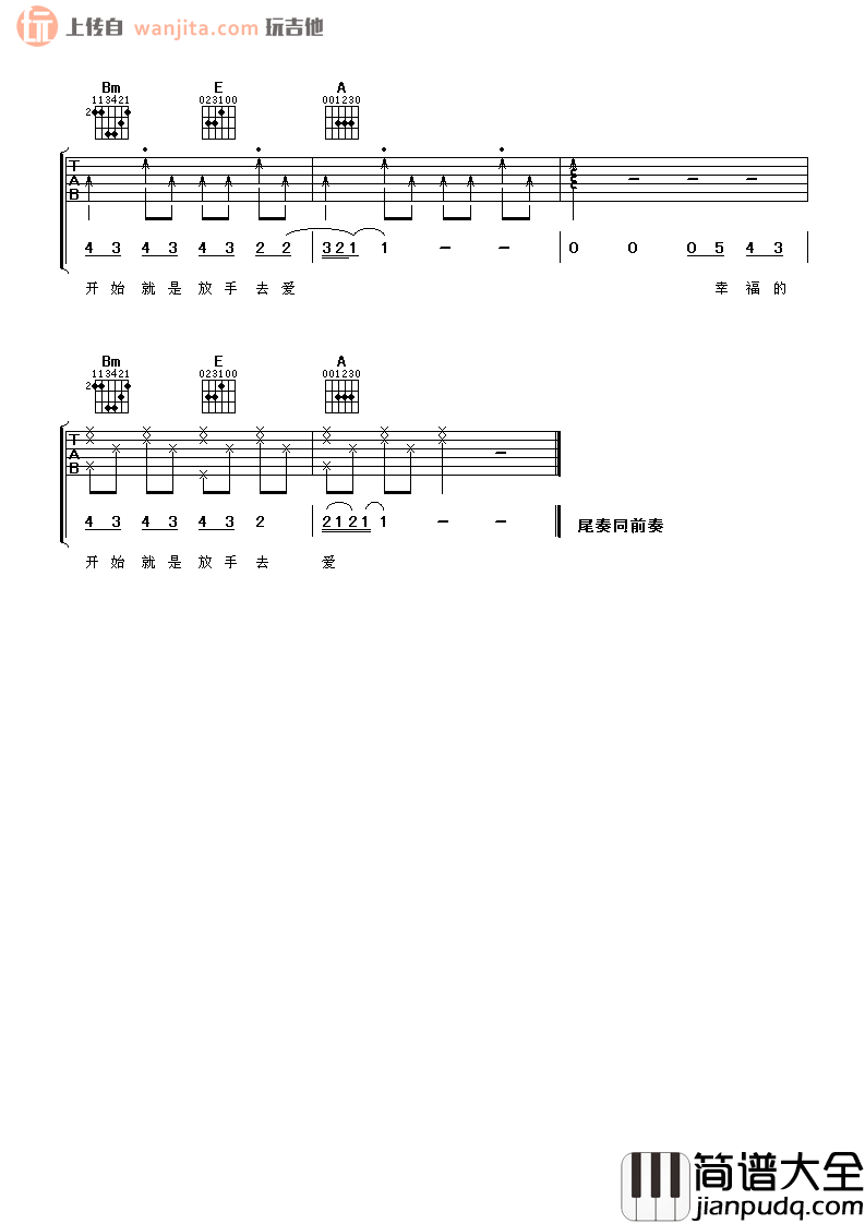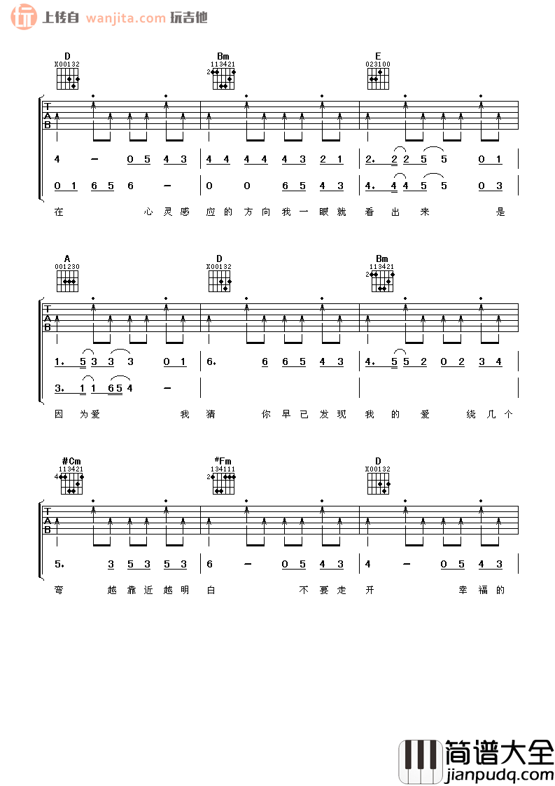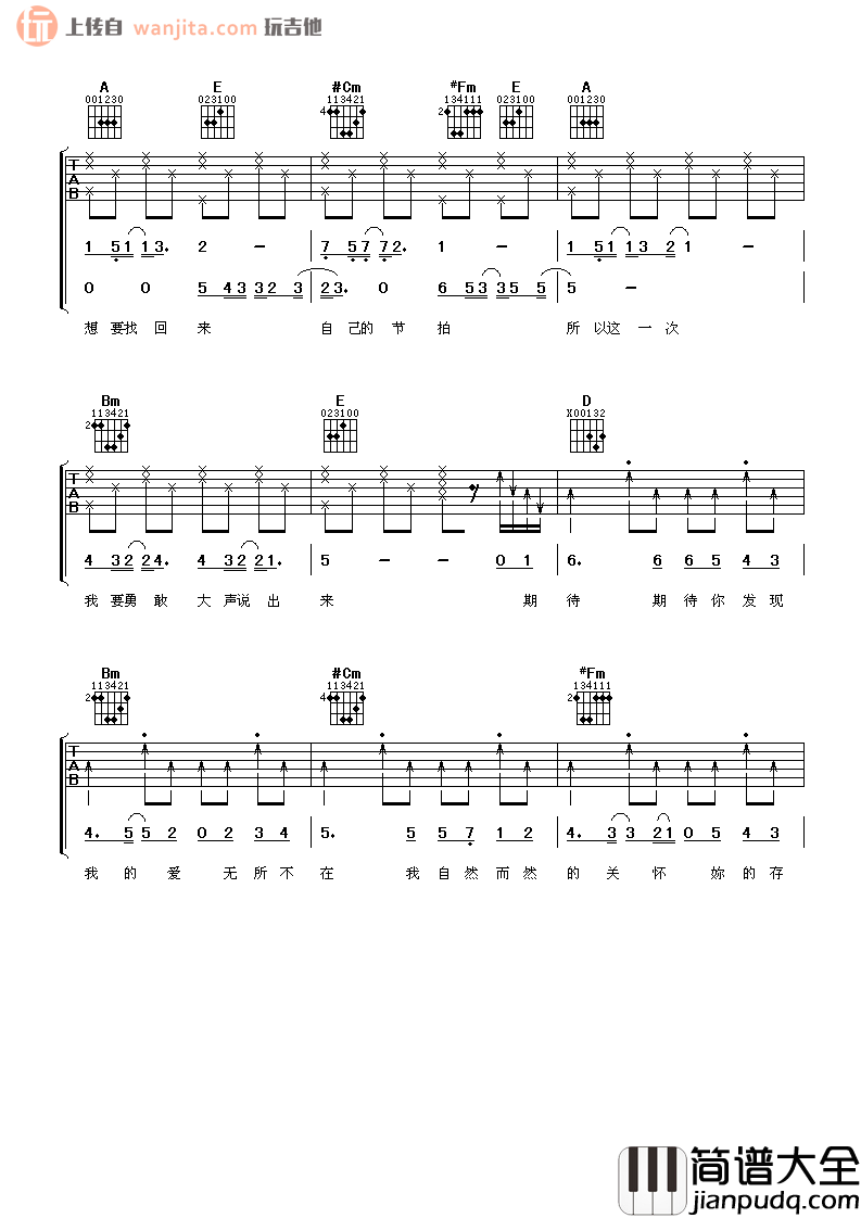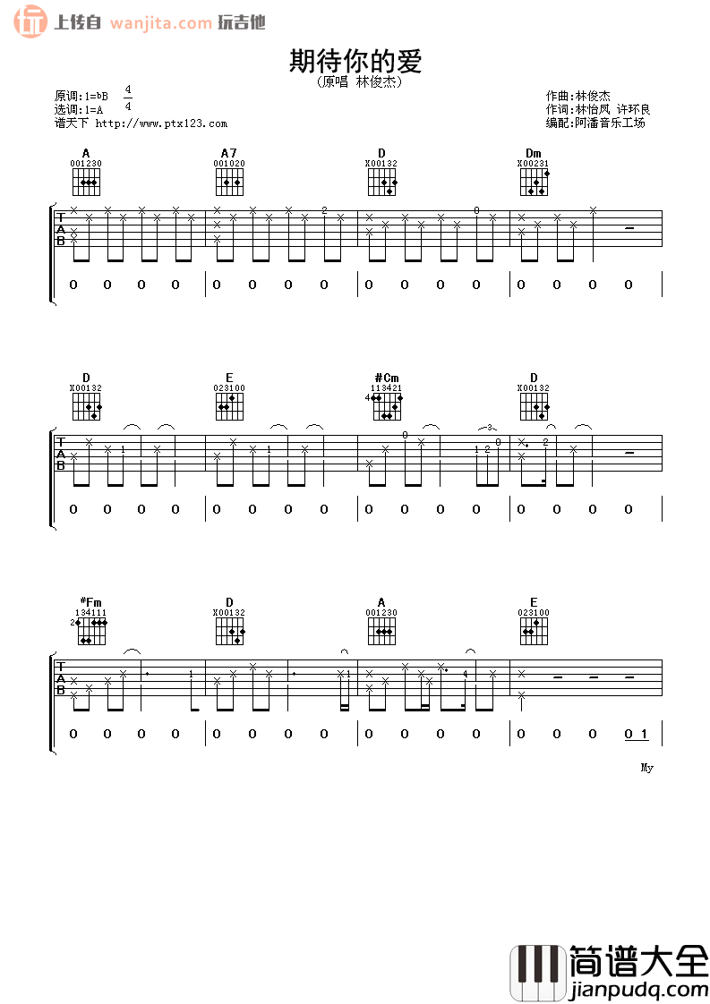 《期待你的爱》吉他谱,总共5张高清图片谱,整首歌曲,原调bB,选用A调编配,弹唱难度不大,新手也可以很好的弹唱。