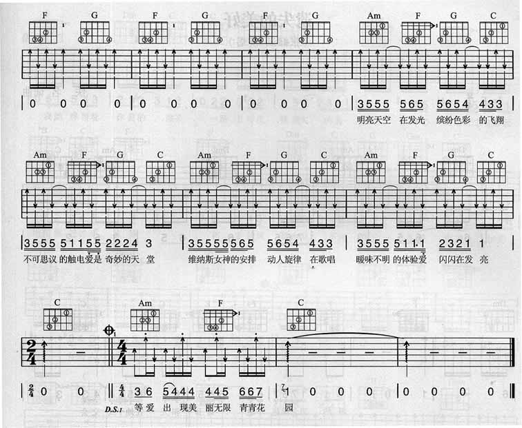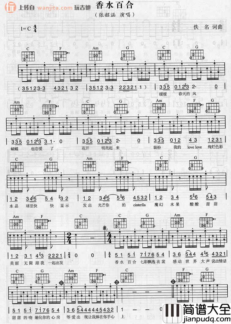 张韶涵《香水百合》吉他谱,总共2张高清图片谱,原调为C调,选用C调指法,节拍4/4拍,不使用变调夹,弹唱难度初级。