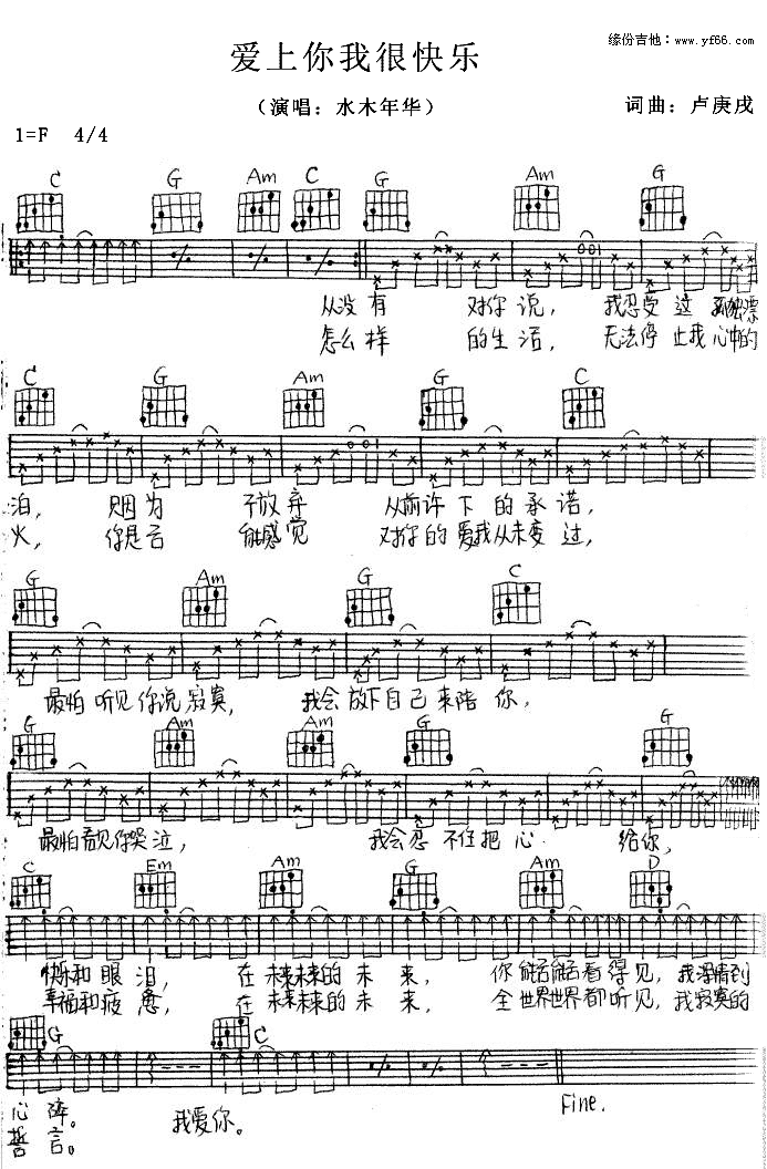 公众号:绵羊乐谱 《爱上你我很快乐》吉他谱,总共1张高清图片谱,选用F调,节拍4/4拍,不使用变调夹,弹唱难度初级。 公众号:绵羊乐谱 | 官方QQ群:978773290 不吃独食,学会分享!本文链接:http://www.shaomingyang.com/btb/32077.html 转载请标明出处,尊重原创(๑╹◡╹)ノ。如信息有误或版权疑问,请通过网站底部联系我们会第一时间处理,感谢理解支持(◕ᴗ◕✿)!