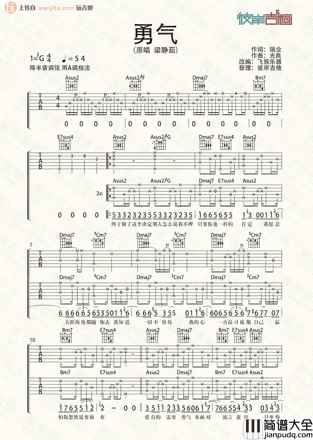 《勇气》吉他谱原调G,降半调调弦,用A调指法,使用六种和弦。这首火遍大江南北的歌曲我想大多数朋友都会弹唱,但这张谱子我个人觉得比较接近于原版,好像表达的能更加清晰,希望大家可以多多尝试不同版本,找到适合自己的谱子。