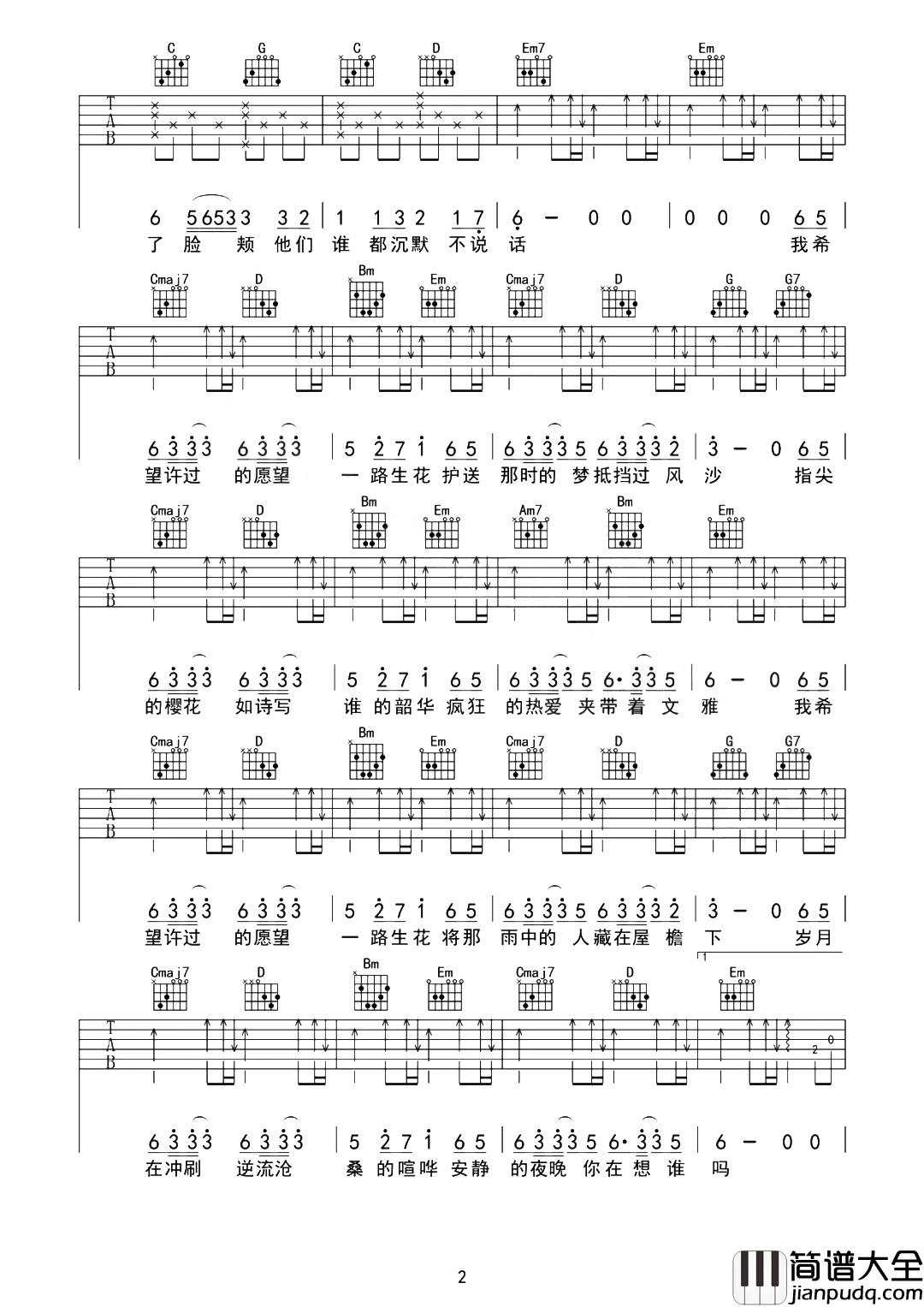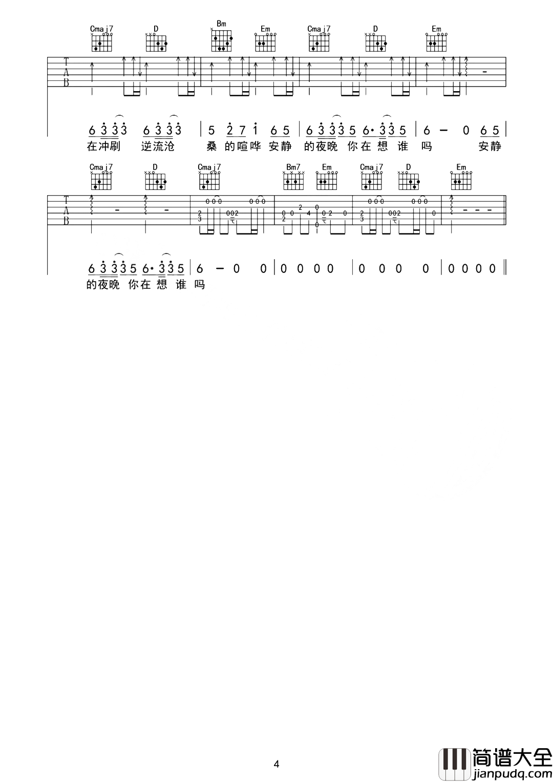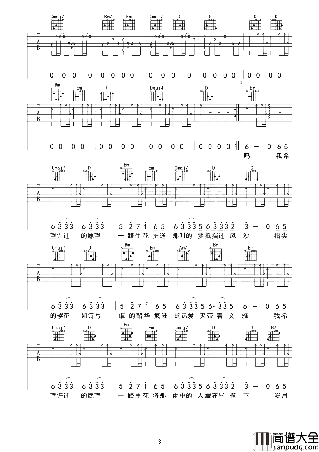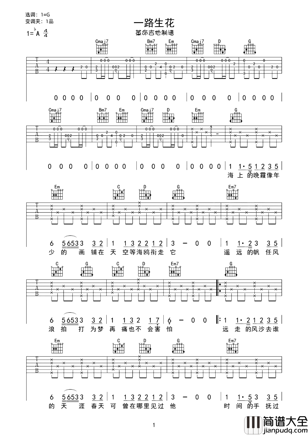 公众号:绵羊乐谱 《一路生花》吉他谱,由革命吉他制谱,共有四张PNG高清六线谱图例,选用G调指法编配,变调夹建议夹1品可弹唱原调bA,节奏4/4拍,按原版扒带制谱,弹唱难度较简单。 《一路生花》吉他弹唱演示+教学视频 《一路生花》吉他谱-图1 《一路生花》吉他谱-图2 《一路生花》吉他谱-图3 《一路生花》吉他谱-图4 公众号:绵羊乐谱 | 官方QQ群:978773290 不吃独食,学会分享!本文链接:http://www.shaomingyang.com/btb/32079.html 转载请标明出处,尊重原创(๑╹◡╹)ノ。如信息有误或版权疑问,请通过网站底部联系我们会第一时间处理,感谢理解支持(◕ᴗ◕✿)!