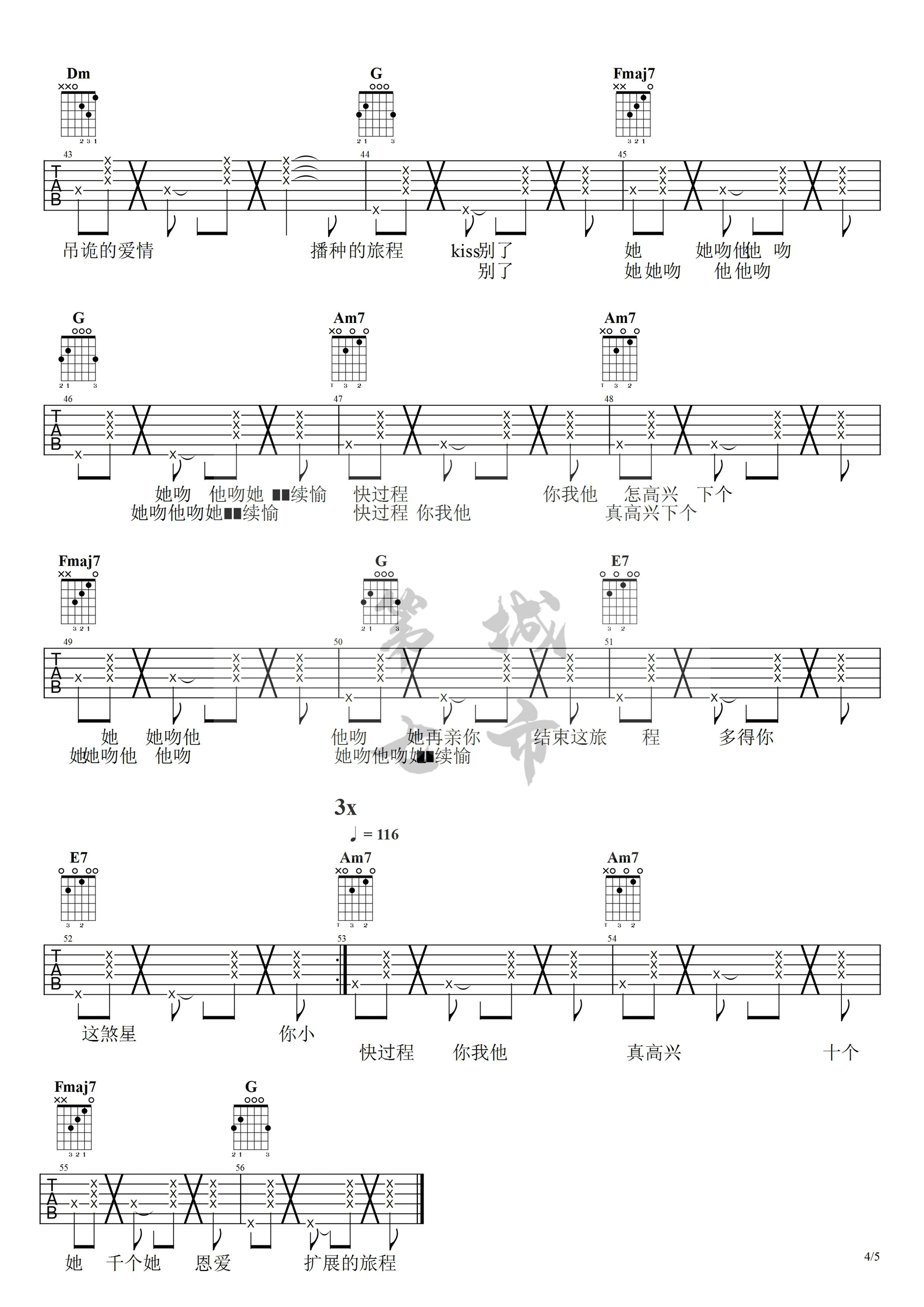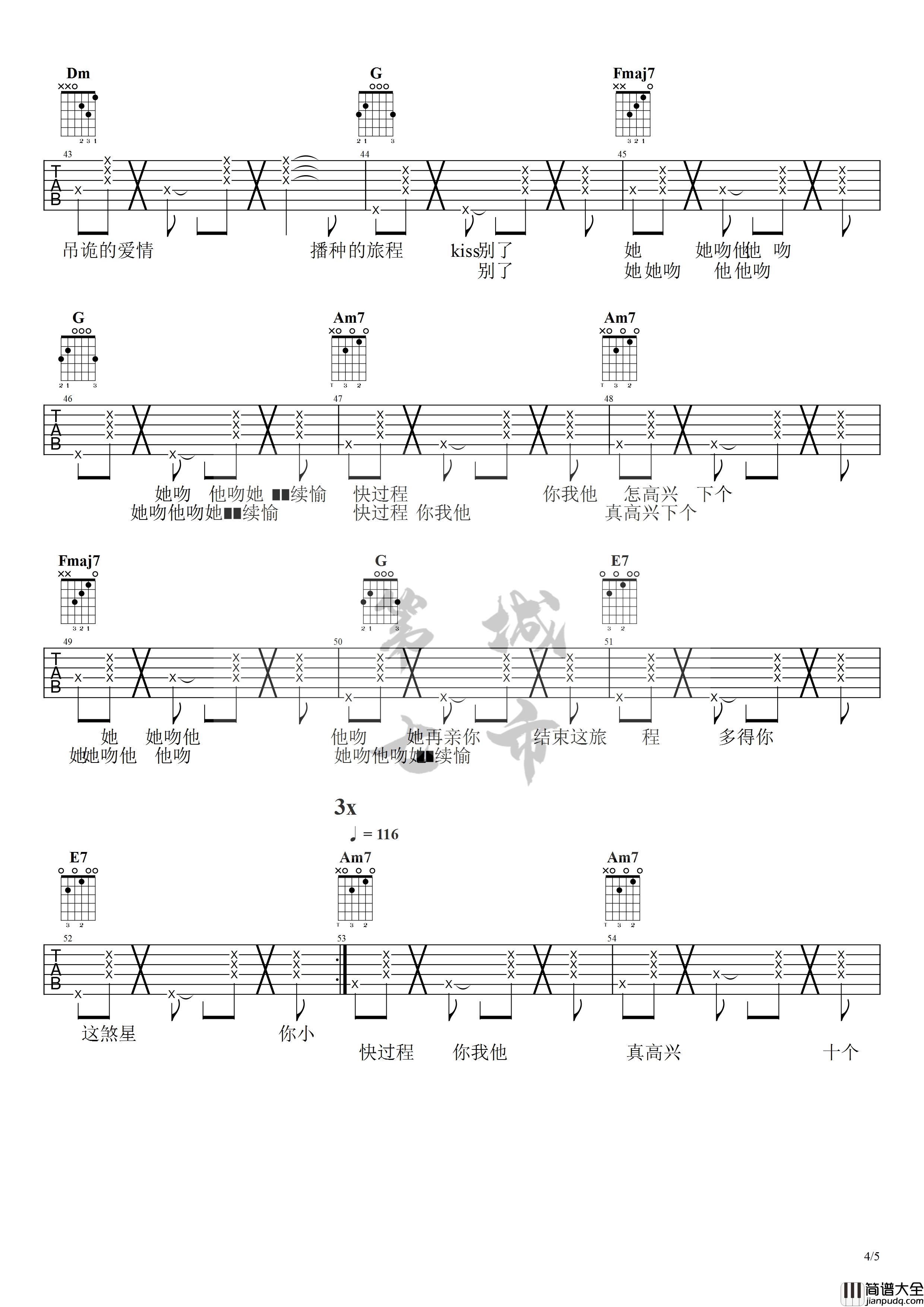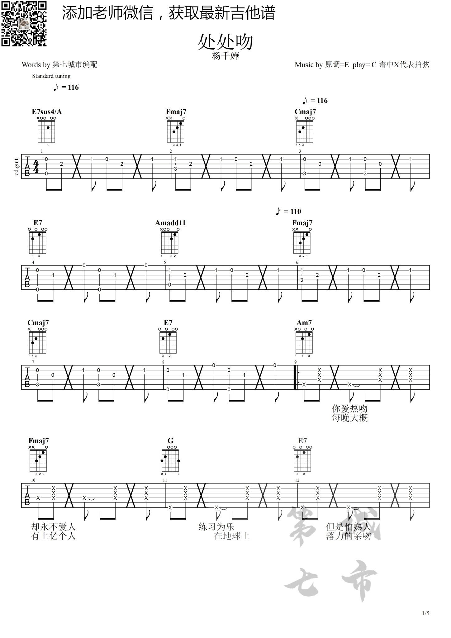 公众号:绵羊乐谱 处处吻这首歌是杨千嬅很好听的一首经典歌曲,这首歌选用C调编配。整首歌是以和弦分解加拍弦的节奏编配,所以还是非常符合这首歌原本的定位。处处吻的音乐一响起,会让人全身上下触电的感觉,一种洒脱而轻松的感觉顿时被全身感染了。 公众号:绵羊乐谱 | 官方QQ群:978773290 不吃独食,学会分享!本文链接:http://www.shaomingyang.com/btb/32150.html 转载请标明出处,尊重原创(๑╹◡╹)ノ。如信息有误或版权疑问,请通过网站底部联系我们会第一时间处理,感谢理解支持(◕ᴗ◕✿)!
