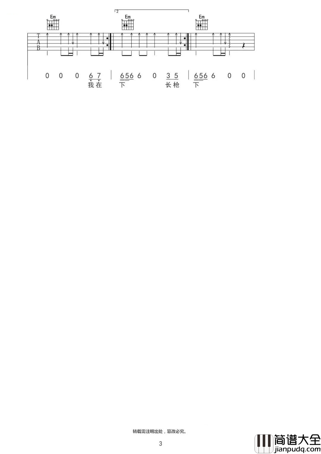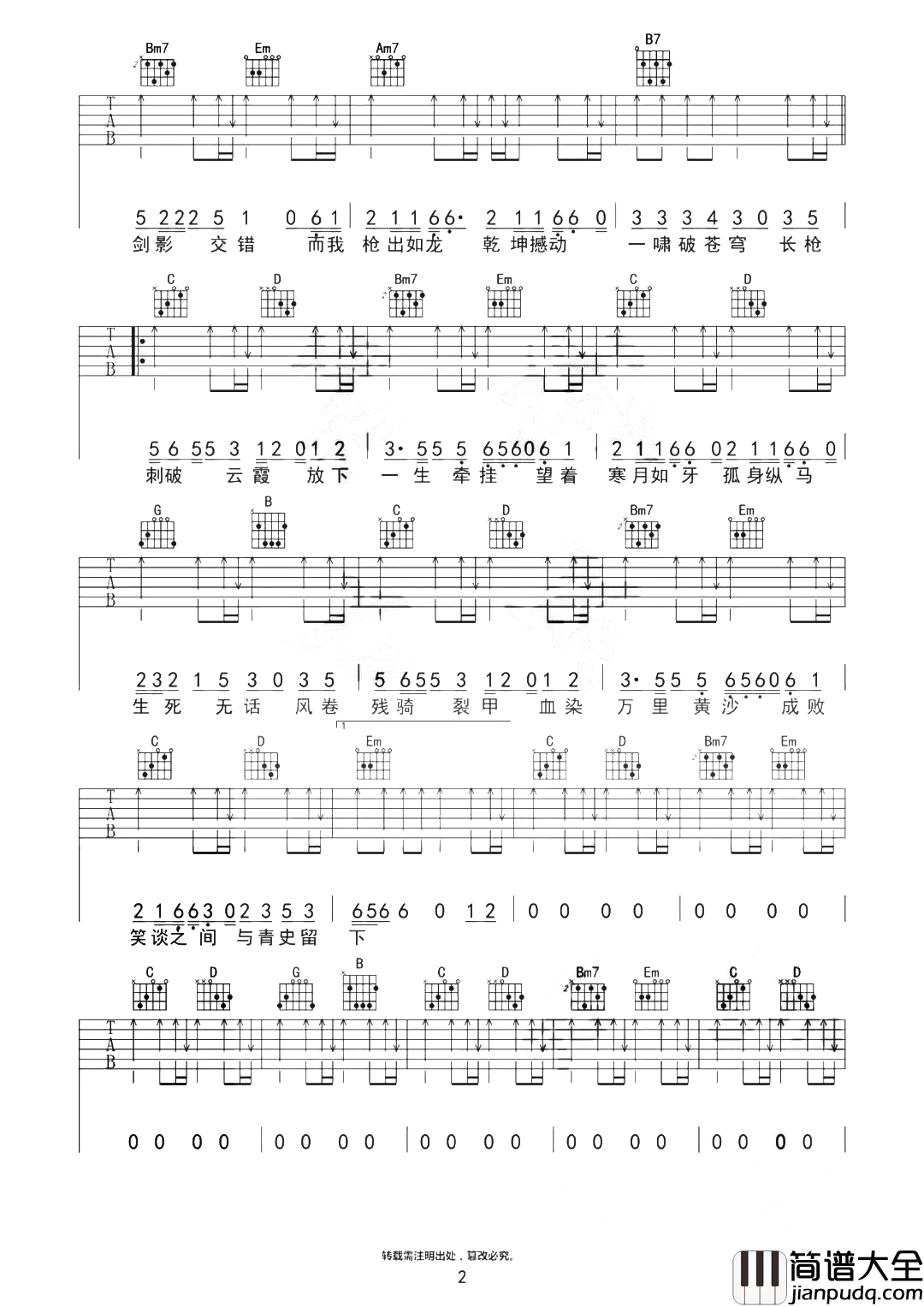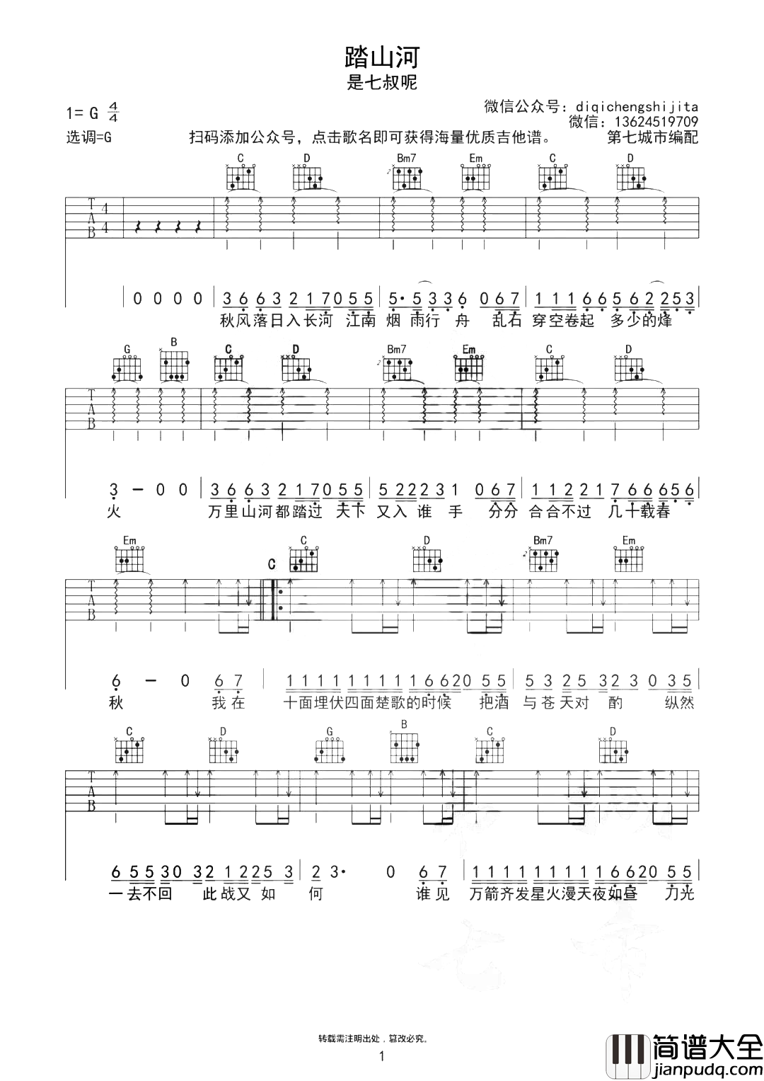 踏山河吉他谱,总共2张高清图片谱,由第七城市编配制谱,选用G调指法弹唱,原调也是G调,标准音调线,不使用变调夹,主要以扫弦的方式弹唱,正好也还原了这首歌曲的原版弹唱节奏,喜欢的朋友可以尝试练习。