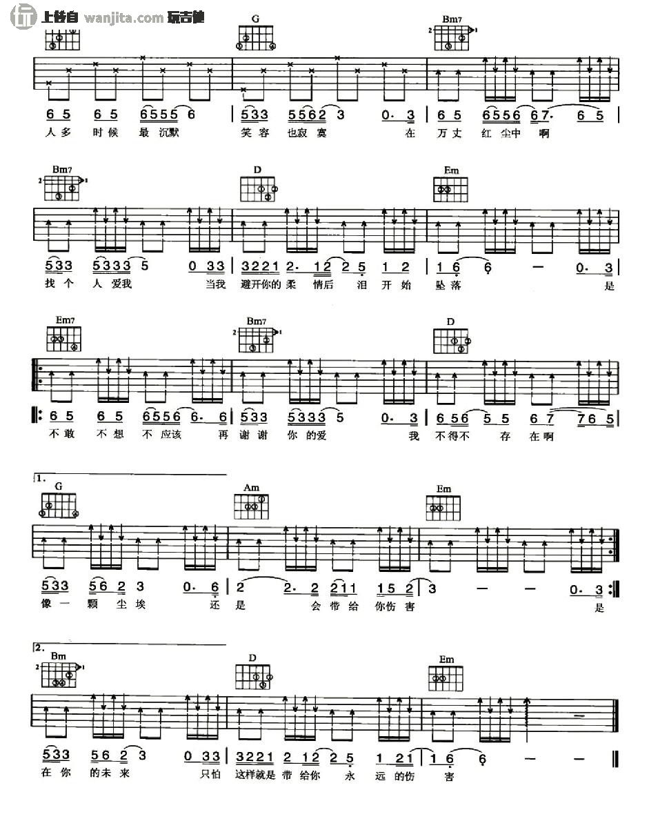 《谢谢你的爱》吉他谱,总共2张高清图片谱,原调为G调,节拍4/4拍,建议不使用变调夹,弹唱难度初级。