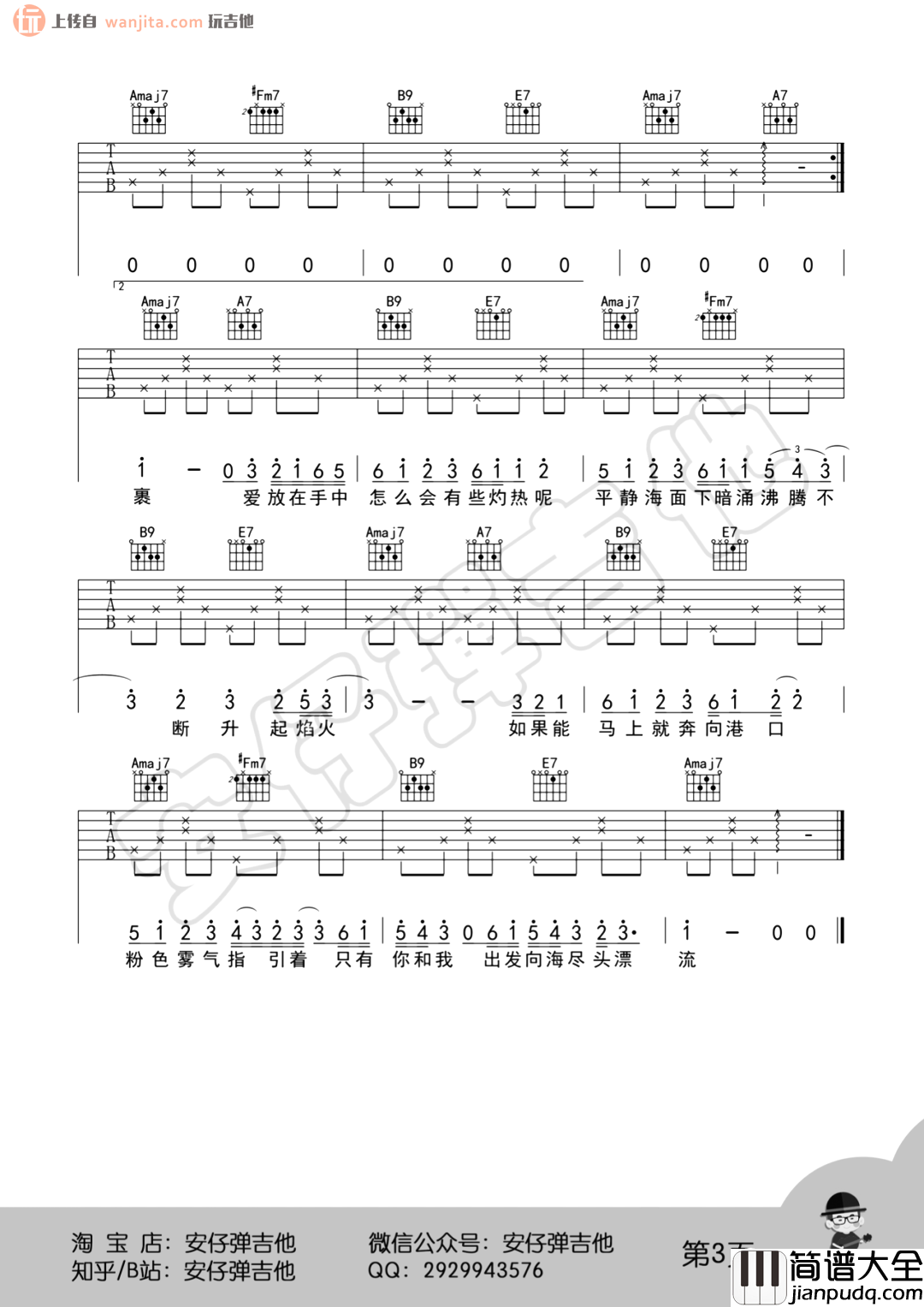 公众号:绵羊乐谱 这首曲谱总共3张高清图片谱例,由王唯安制谱分享。原调A调,选用A调指法,不使用变调夹。这首歌曲虽然好听但是弹唱难度比较大,不适合新手学习,大家需要注意前奏和和弦的变化,多多练习。 《粉雾海》吉他弹唱演示视频 公众号:绵羊乐谱 | 官方QQ群:978773290 不吃独食,学会分享!本文链接:http://www.shaomingyang.com/btb/32171.html 转载请标明出处,尊重原创(๑╹◡╹)ノ。如信息有误或版权疑问,请通过网站底部联系我们会第一时间处理,感谢理解支持(◕ᴗ◕✿)!