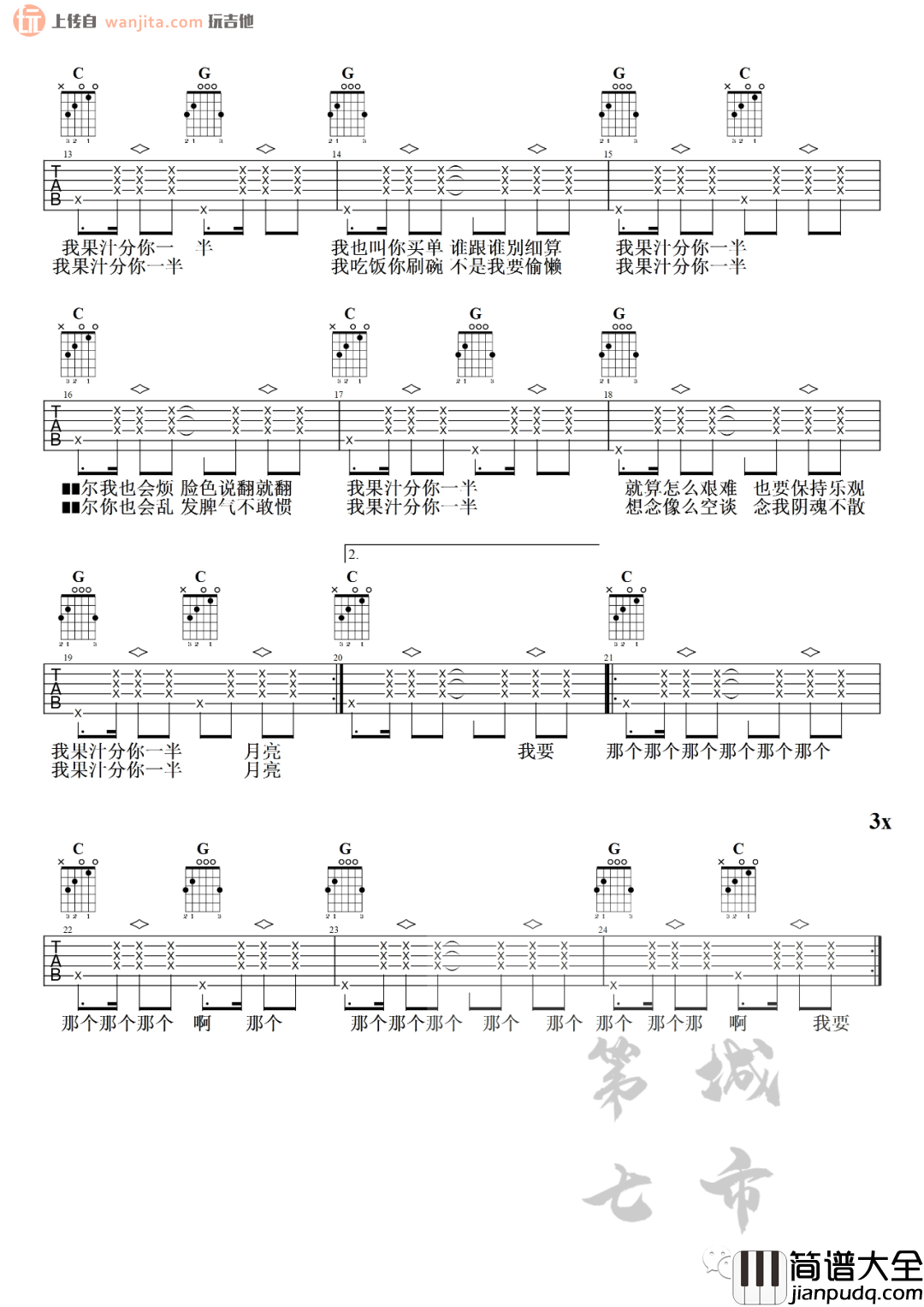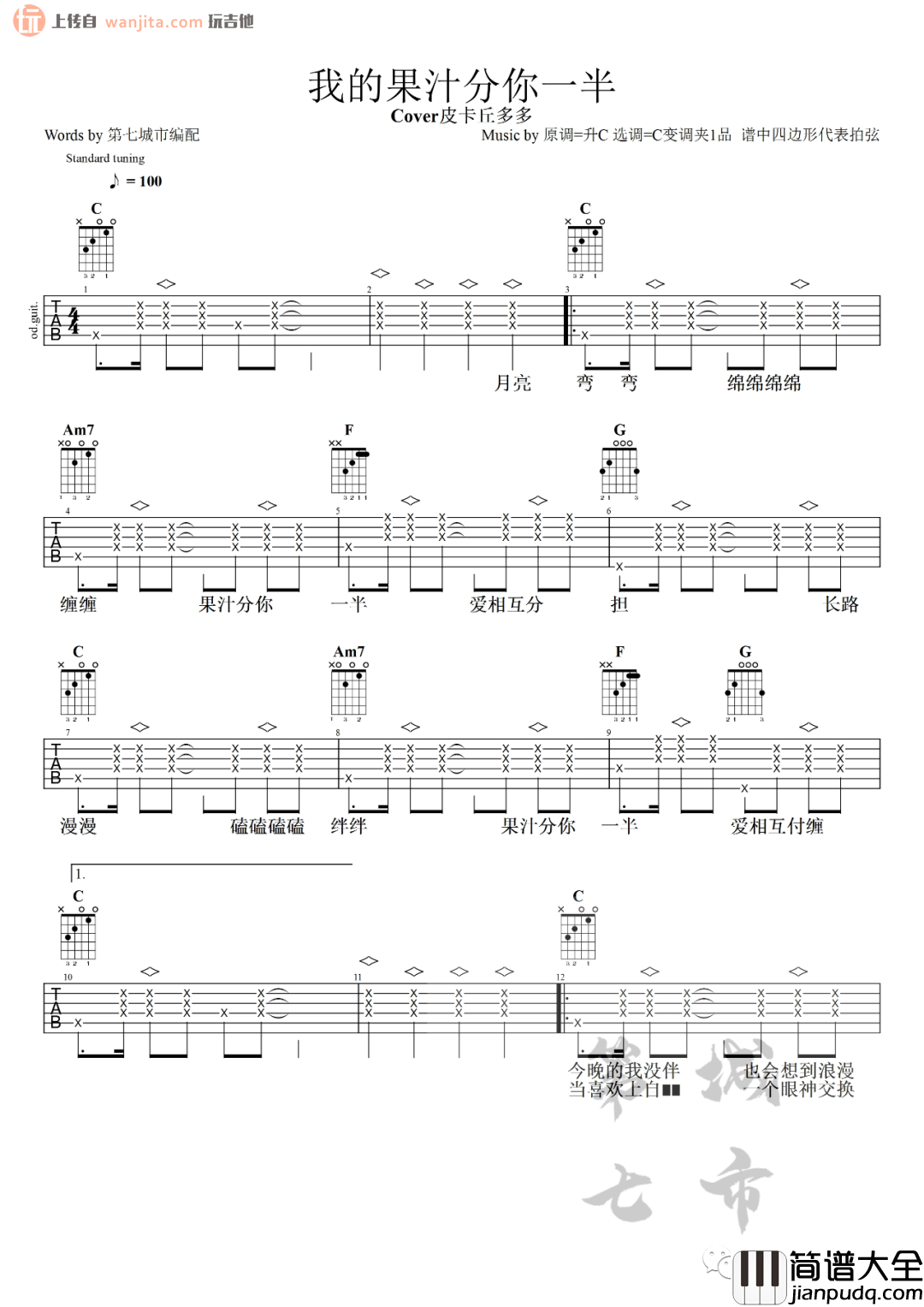 《我的果汁分你一半》吉他谱,原调#C调,选用C调指法编配,变调夹夹1品可以按原调弹唱,这首歌节奏还算比较简单,朋友们要注意滞音和拍弦的出现,图中四边形则代表的拍弦,会让这首歌拥有更加丰富的节奏,弹唱会更加得心应手,非常推荐这首吉他谱,适合即兴玩乐制造分为,会发现这样弹唱非常有意思。