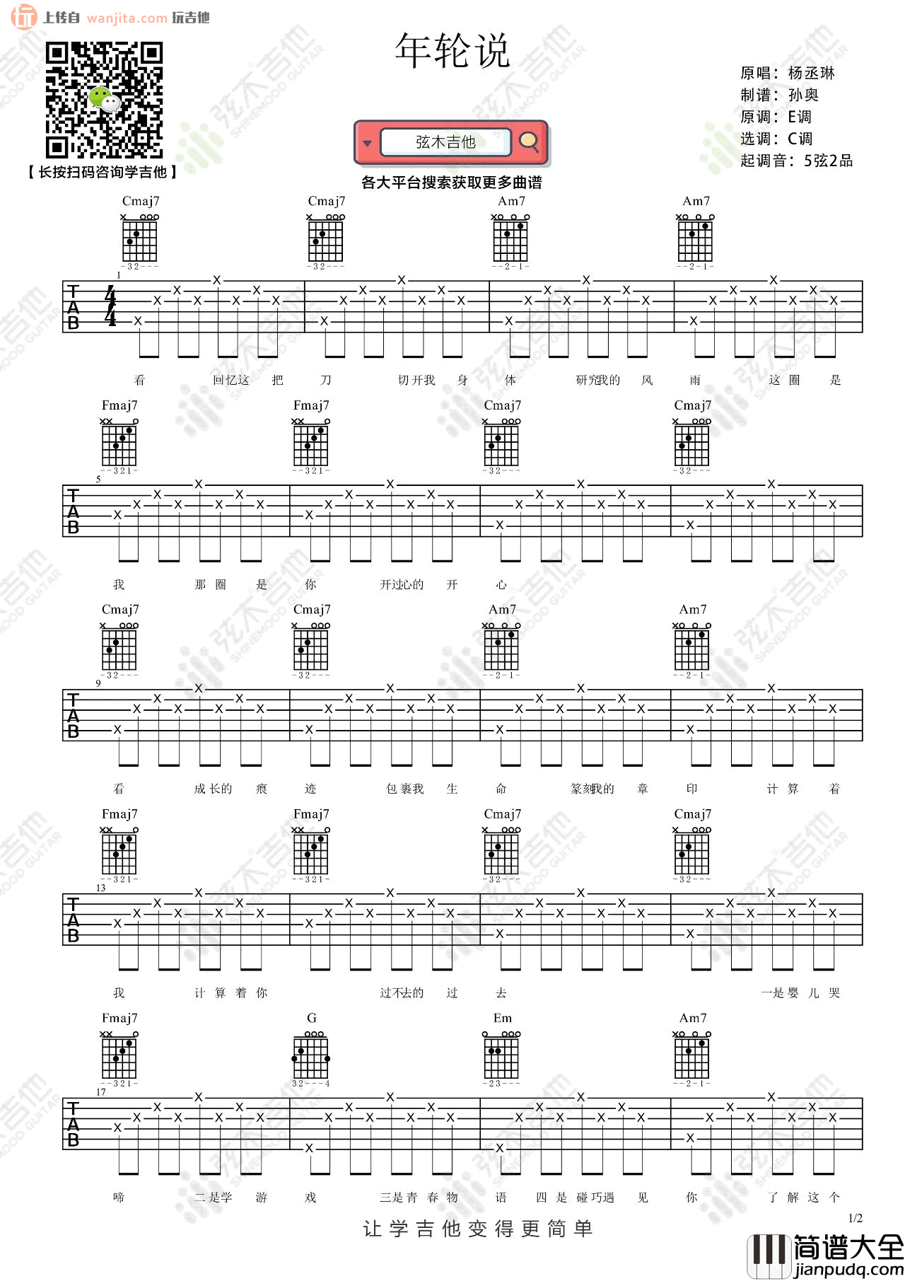 《年轮说》吉他谱,由弦木吉他提供分享编配,原调是E调,选用C调指法编配,非常标准的分解和弦,这首谱子的版本可谓是新手练习的标准节奏。