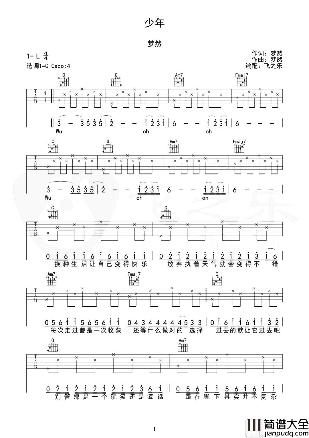 梦然《少年》吉他谱,由飞之乐编配制谱,本谱为C调吉他弹唱谱,变调夹建议夹4品弹唱原调E调,节奏4/4拍,本谱基本上还原原版,弹唱难度较为简单。