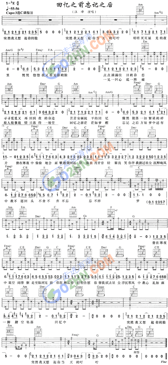 回忆之前忘记之后吉他谱,总共1张高清图片谱,原调为降E调,选用C调指法,节拍4/4拍,速度每分钟55-56BPM,弹唱建议变调夹夹3品,弹唱难度初级。