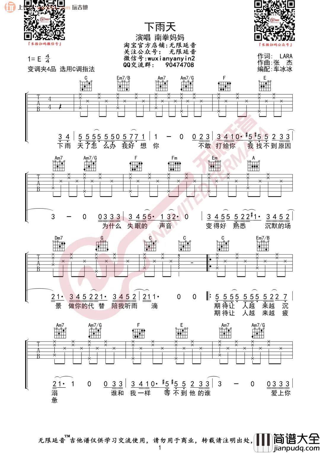 《下雨天》吉他谱原调是E调,这个版本选用的C调指法编配,变调夹可以夹在第四品,整个吉他谱的编配比较简单适合新手弹唱,常规的分解和弦作为主要的伴奏,这首歌是一首南拳妈妈非常好听的代表作歌曲,原唱是由Lara梁心颐演唱,我们记忆中的这首歌,是一种甜美而让人怜悯的声音,最让人记忆深刻的那一句不是副歌,我想应该是开头那一句“下雨天了怎么办,我好想你”,你们有觉得吗?