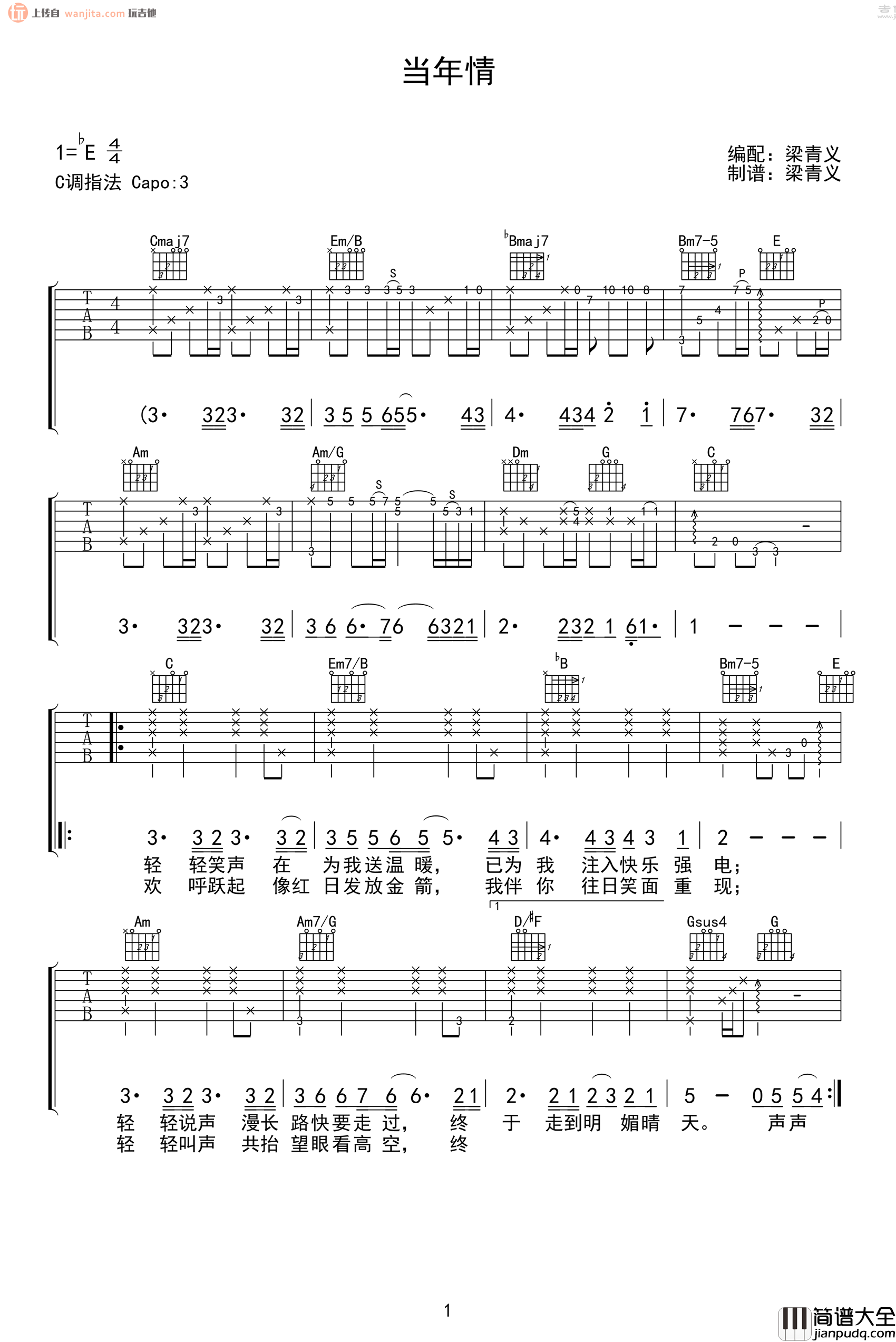《当年情》吉他谱,张国荣演唱的一首经典抒情歌曲,经典香港电影《英雄本色》主题曲。当年情C调六线张高清图片谱,包含丰富的完整前奏和尾奏,弹唱难度适中,主要也就是在solo部分需要多花点功夫,感谢梁青义制谱分享,玩吉他整理上传。