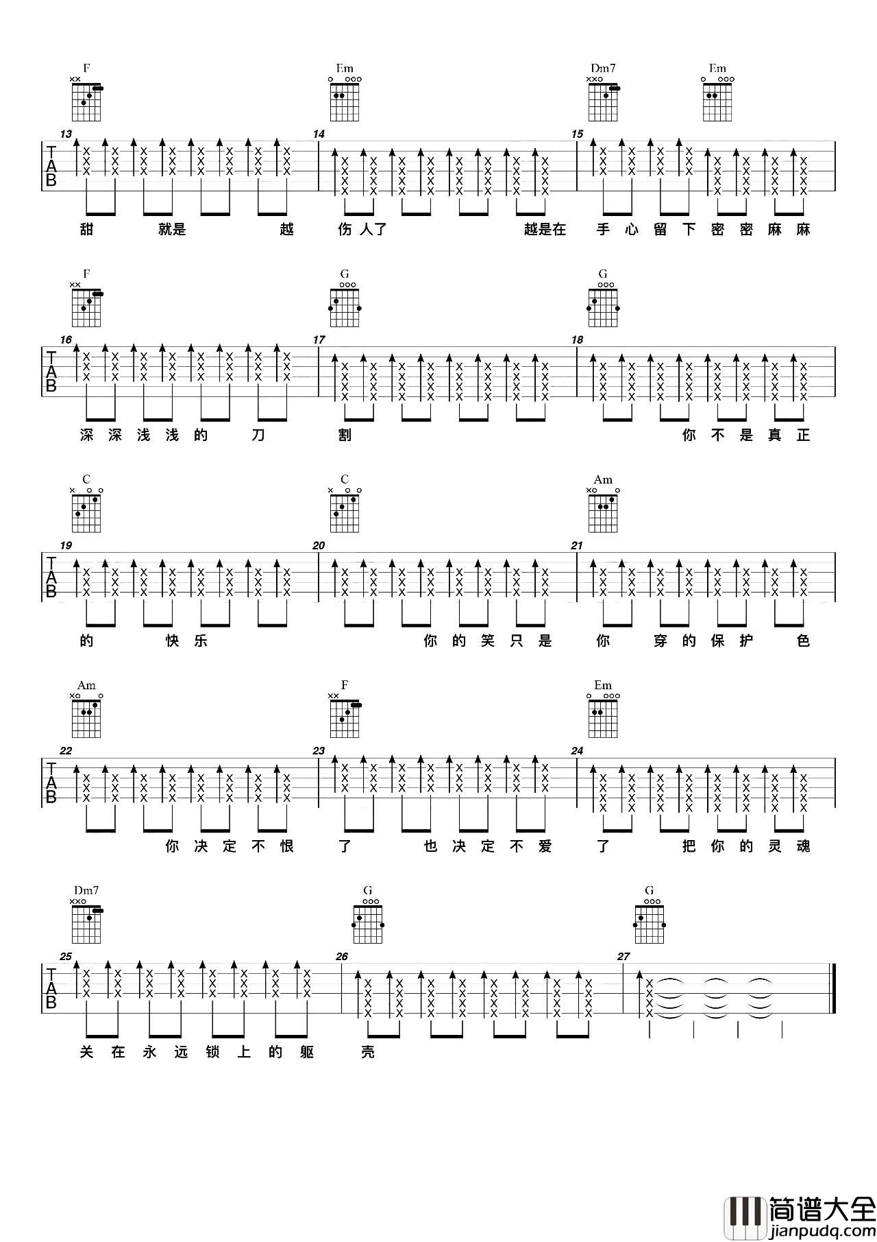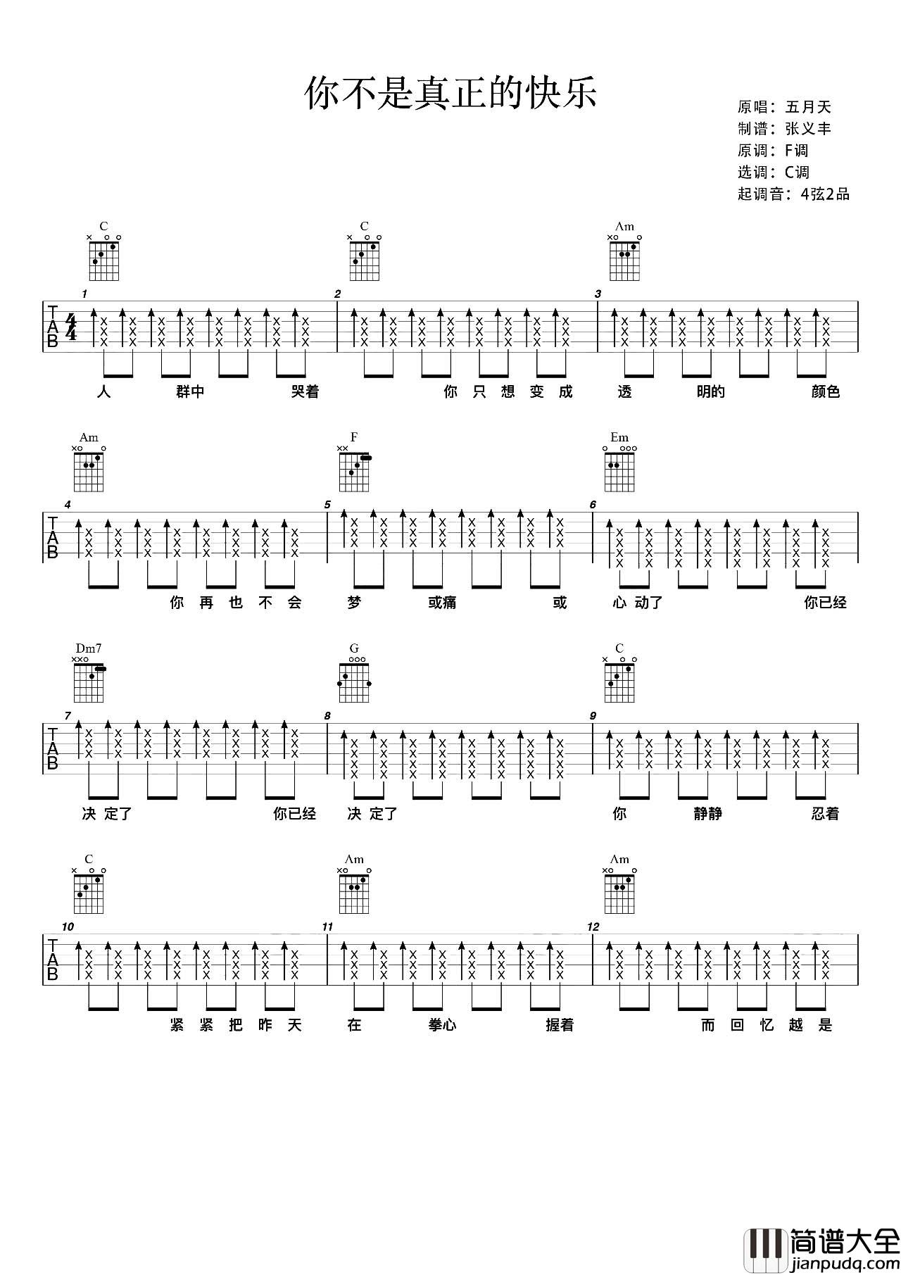 公众号:绵羊乐谱 《你不是真正的快乐》共两张图片谱,由弦木音乐制谱,原调F选调C,男生推荐夹五品变为原调,女生可以不用变调夹高八度演唱。 《你不是真正的快乐》吉他弹唱教学 公众号:绵羊乐谱 | 官方QQ群:978773290 不吃独食,学会分享!本文链接:http://www.shaomingyang.com/btb/32307.html 转载请标明出处,尊重原创(๑╹◡╹)ノ。如信息有误或版权疑问,请通过网站底部联系我们会第一时间处理,感谢理解支持(◕ᴗ◕✿)!
