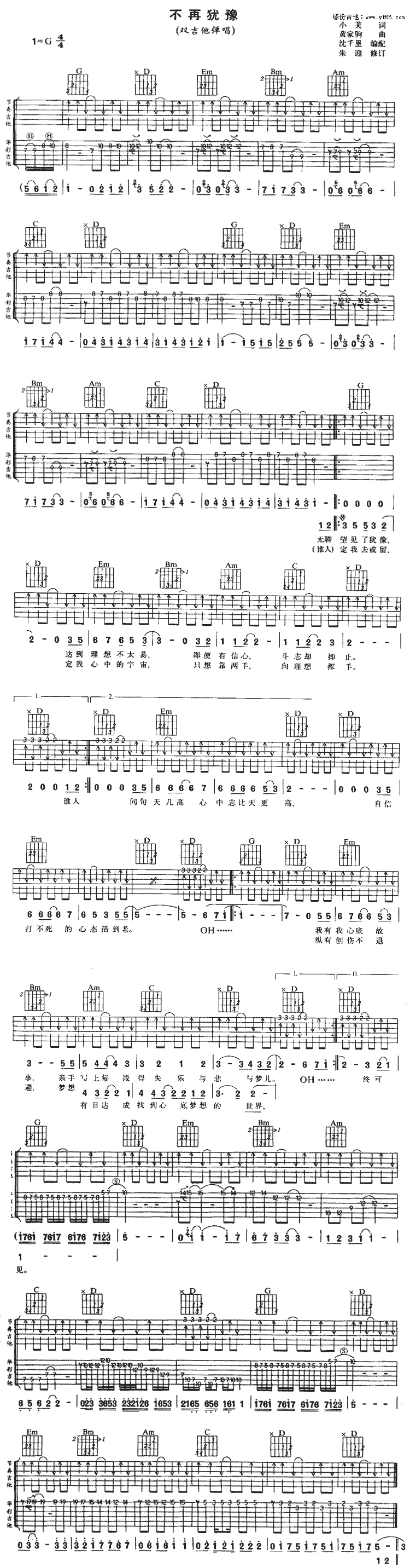 《不再犹豫》吉他谱,由沈千里制谱编配,总共1张高清图片谱,G调指法吉他弹唱谱,标准调音可不用变调夹,本谱按双吉他版编配前奏/间奏/尾奏的solo部分,弹唱难度适中。
