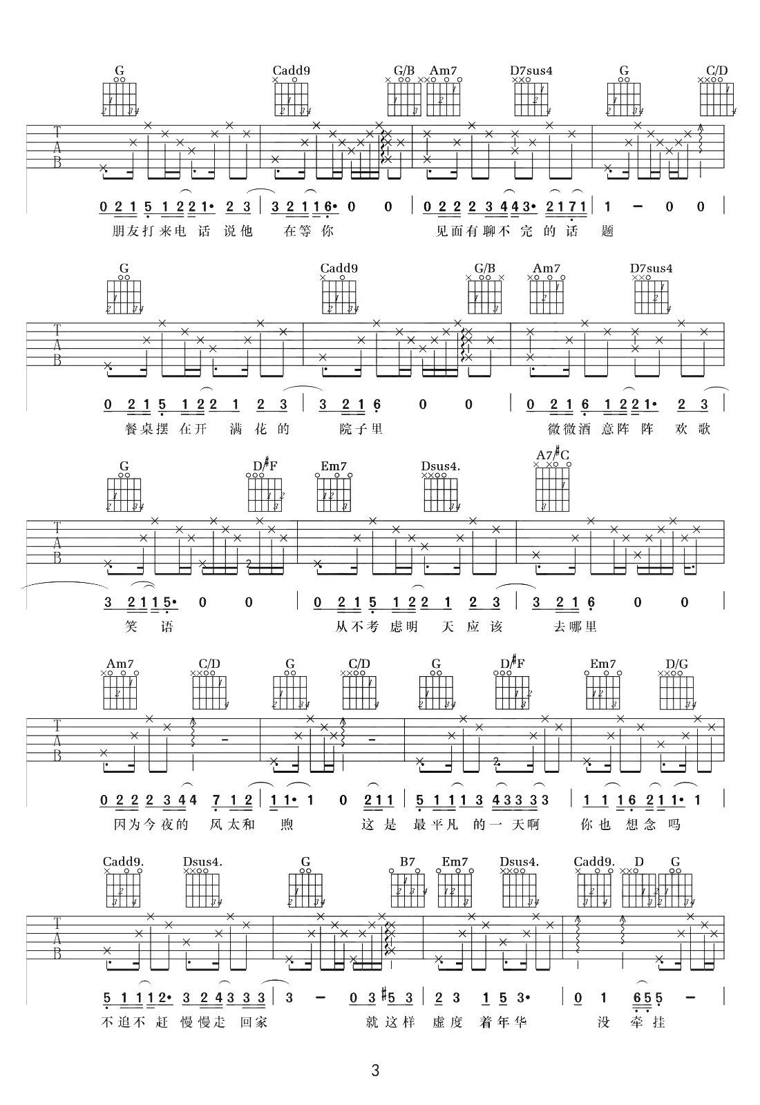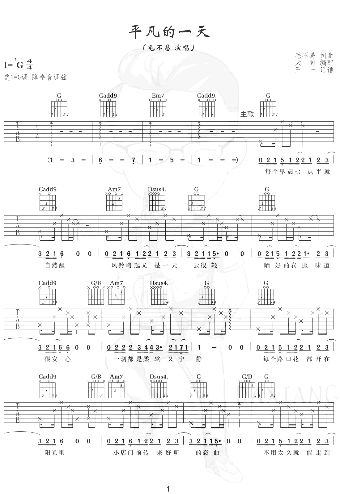 公众号:绵羊乐谱 毛不易一首伴奏以吉他为主的歌,《向往的生活》第三季主题曲,平凡的一天吉他谱,原调bG,选用G调指法,降半音调弦。《平凡的一天》吉他弹唱六线谱,完整版共四张图片谱例。 公众号:绵羊乐谱 | 官方QQ群:978773290 不吃独食,学会分享!本文链接:http://www.shaomingyang.com/btb/32367.html 转载请标明出处,尊重原创(๑╹◡╹)ノ。如信息有误或版权疑问,请通过网站底部联系我们会第一时间处理,感谢理解支持(◕ᴗ◕✿)!