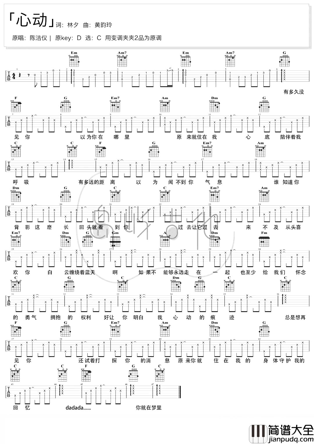 心动吉他谱,陈洁仪演唱,选用C调,原调D调,变调夹2品弹唱,《心动》吉他六线张高清图片谱,包含前奏版本完整,弹唱难度初级简单,随谱附《心动》吉他演示+教学视频,大家可进行参考。