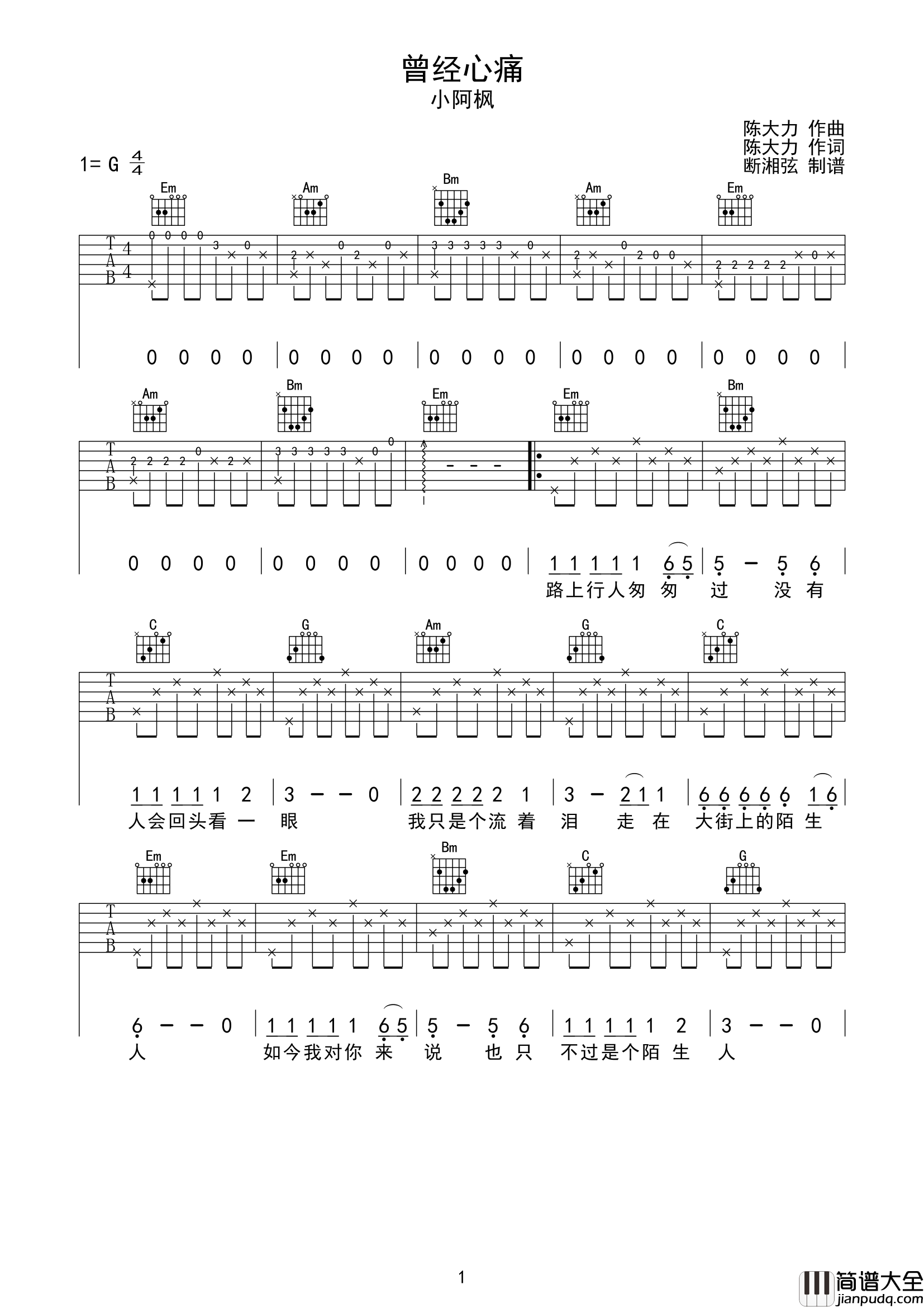 公众号:绵羊乐谱 《曾经心痛》这首曲谱总共2张高清图片谱,选用G调指法编配,包含完整的前奏,弹唱难度较为简单。 公众号:绵羊乐谱 | 官方QQ群:978773290 不吃独食,学会分享!本文链接:http://www.shaomingyang.com/btb/32373.html 转载请标明出处,尊重原创(๑╹◡╹)ノ。如信息有误或版权疑问,请通过网站底部联系我们会第一时间处理,感谢理解支持(◕ᴗ◕✿)!