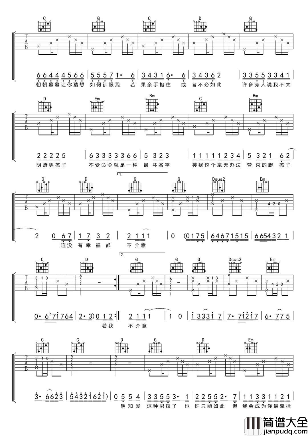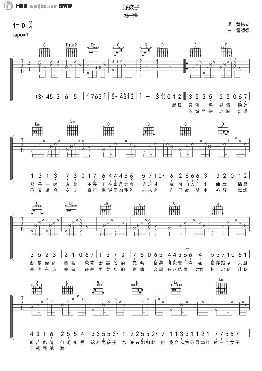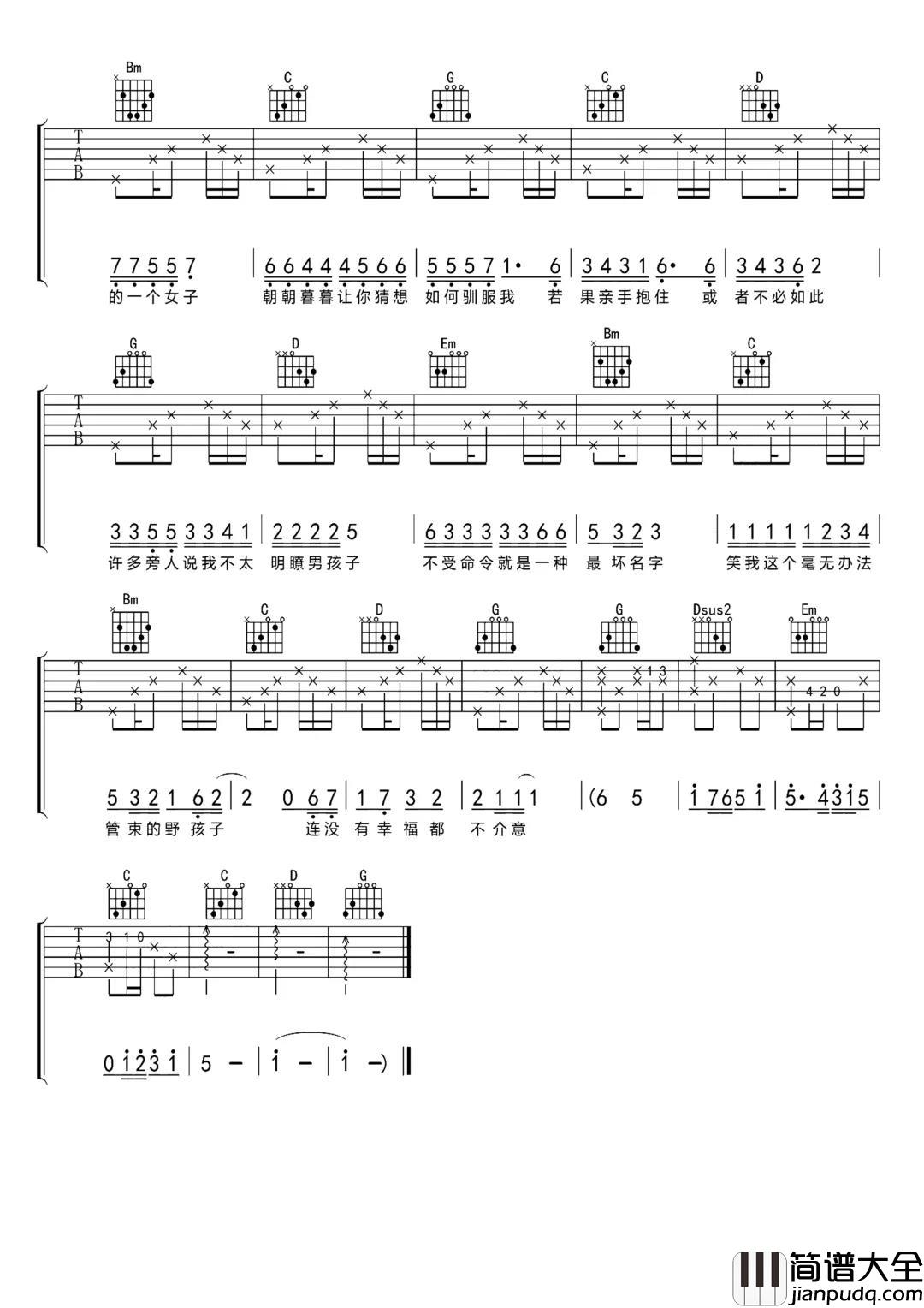 《野孩子》吉他谱,选用D调指法编配,变调夹可以夹在7品,当然男声可以根据自己的音域决定,推荐可以夹三品处,这首歌包含了前奏,节拍的停顿会是主歌的分解和弦需要注意的部分。这首谱子的编配中,并没有像打磨初级谱子般的那么简单,反而在细节上,跟注重了每一个音的处理和落地。