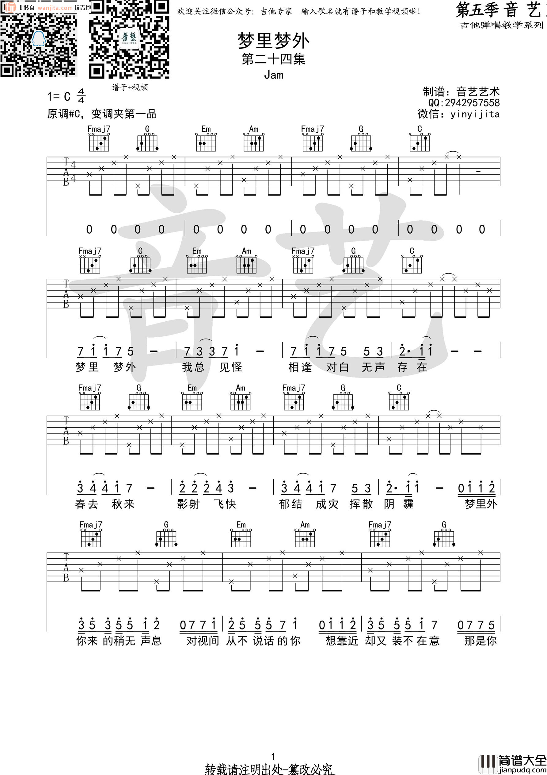 《梦里梦外》吉他谱,总共3张高清图片谱,原调为升C调,选用C调指法,节拍4/4拍,弹唱建议使用变调夹夹一品,弹唱难度初级。