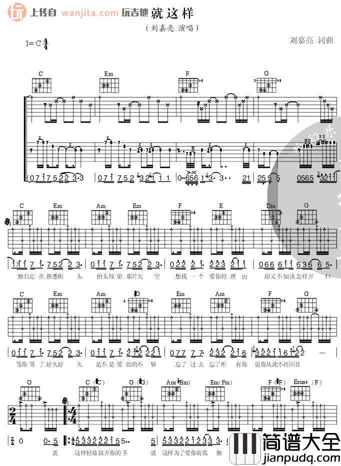 就这样吉他谱是刘嘉亮唱作的歌曲,总共一张图片谱,这首歌选用C调编配,不管是节奏来说,相对来说,稍微有一点复杂和难度,需要多加练习才可以。歌曲描述了爱情走到尽头时候的一种洒脱与分手。