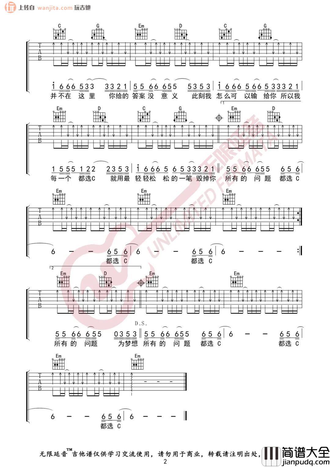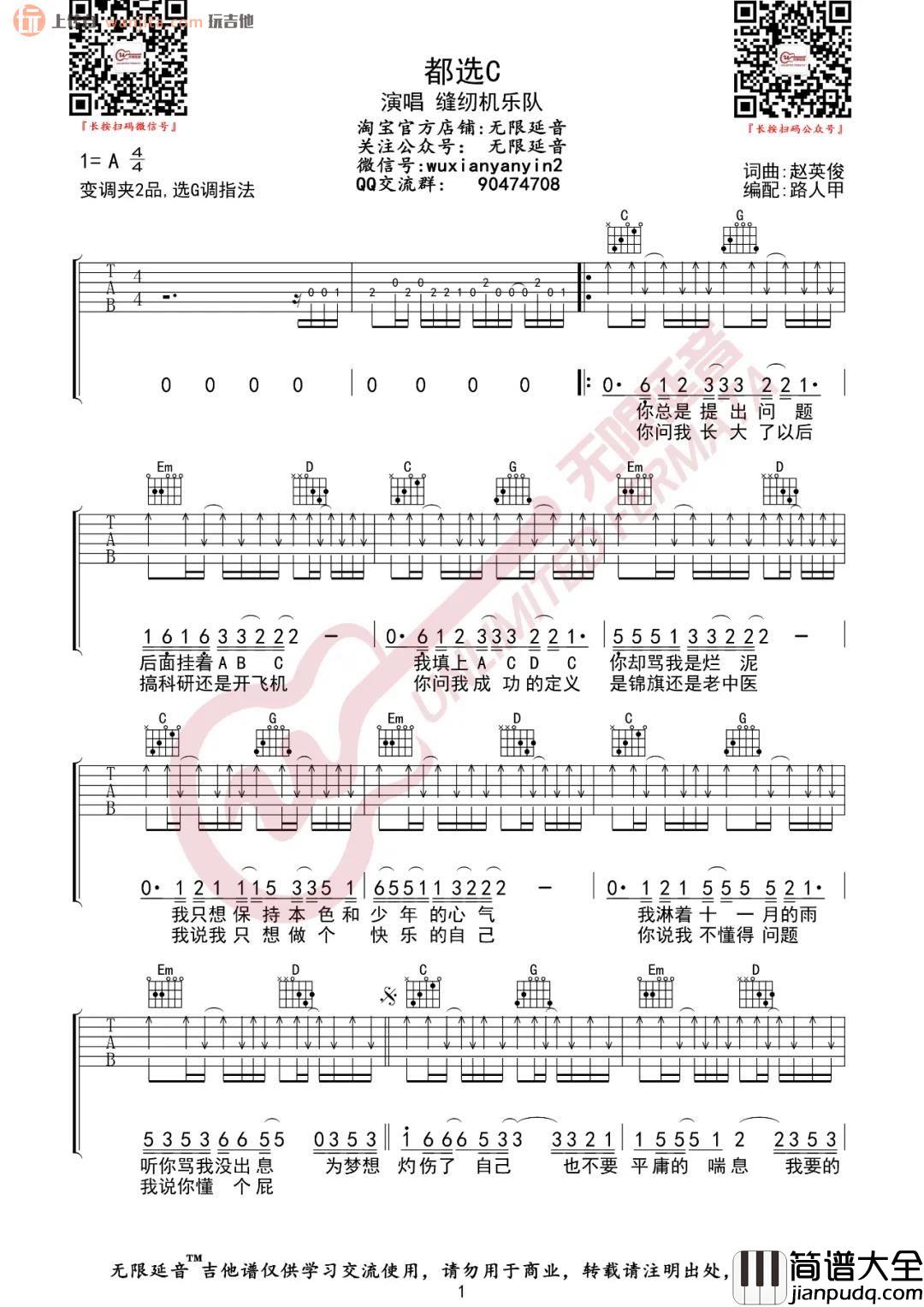 缝纫机乐队《都选C》吉他谱原调是A调,这个编配版本是选用G调指法,变调夹夹在第二品,全首歌的节奏都是非常律动的扫弦处理,弹好扫弦部分的层次感可以让整首歌更加的激昂活跃。