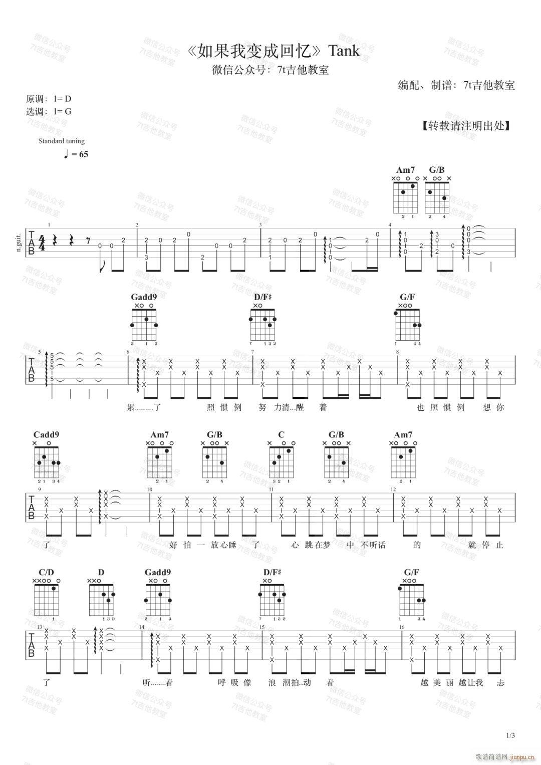 公众号:绵羊乐谱 如果我变成回忆 ( G调原版) 免费弹唱吉他谱_六线谱/词曲:Tank 点击: (网络) 公众号:绵羊乐谱 | 官方QQ群:978773290 不吃独食,学会分享!本文链接:http://www.shaomingyang.com/btb/32546.html 转载请标明出处,尊重原创(๑╹◡╹)ノ。如信息有误或版权疑问,请通过网站底部联系我们会第一时间处理,感谢理解支持(◕ᴗ◕✿)!