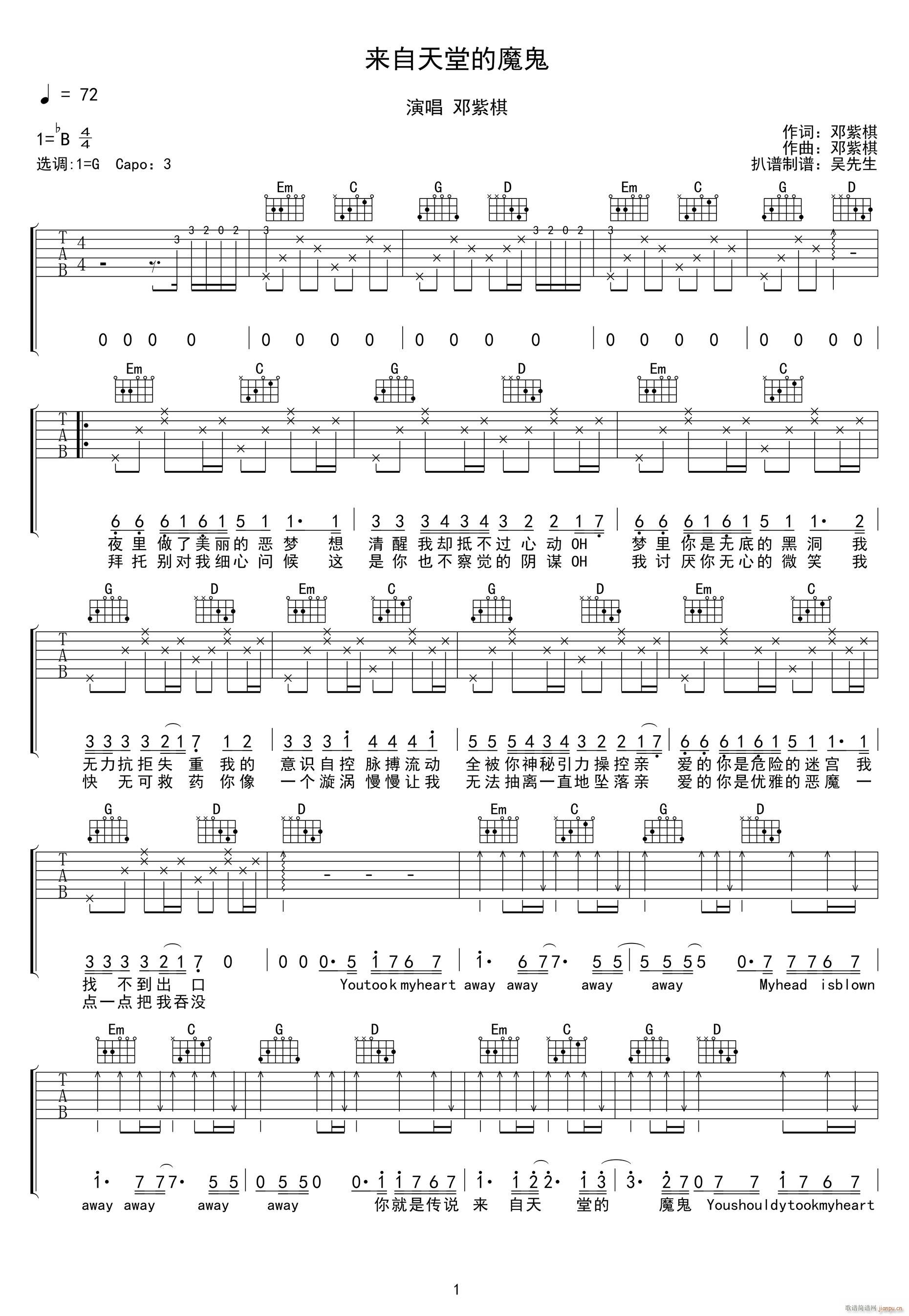 公众号:绵羊乐谱 来自天堂的魔鬼 ( G调原版) 免费弹唱吉他谱_六线谱/词曲:邓紫棋 点击: (网络) 公众号:绵羊乐谱 | 官方QQ群:978773290 不吃独食,学会分享!本文链接:http://www.shaomingyang.com/btb/32606.html 转载请标明出处,尊重原创(๑╹◡╹)ノ。如信息有误或版权疑问,请通过网站底部联系我们会第一时间处理,感谢理解支持(◕ᴗ◕✿)!