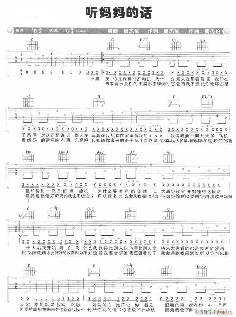 公众号:绵羊乐谱 听妈妈的话 ( G调原版编配) 免费弹唱吉他谱_六线谱/词曲:周杰伦 点击: (网络) 公众号:绵羊乐谱 | 官方QQ群:978773290 不吃独食,学会分享!本文链接:http://www.shaomingyang.com/btb/32754.html 转载请标明出处,尊重原创(๑╹◡╹)ノ。如信息有误或版权疑问,请通过网站底部联系我们会第一时间处理,感谢理解支持(◕ᴗ◕✿)!