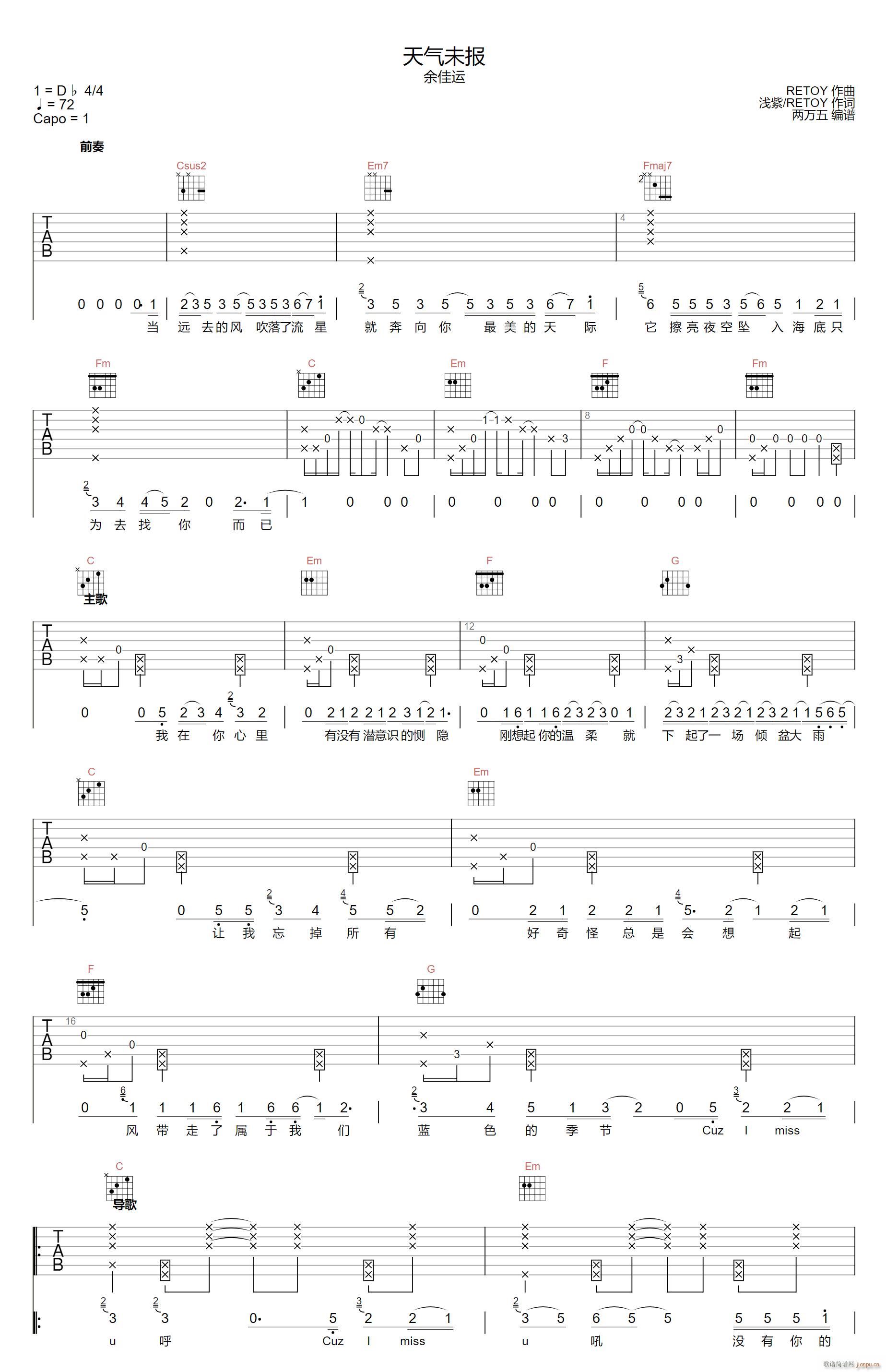 公众号:绵羊乐谱 天气未报 ( C调指法原版) 免费弹唱吉他谱_六线谱/词曲:余佳运 点击: (两万五) 公众号:绵羊乐谱 | 官方QQ群:978773290 不吃独食,学会分享!本文链接:http://www.shaomingyang.com/btb/32759.html 转载请标明出处,尊重原创(๑╹◡╹)ノ。如信息有误或版权疑问,请通过网站底部联系我们会第一时间处理,感谢理解支持(◕ᴗ◕✿)!