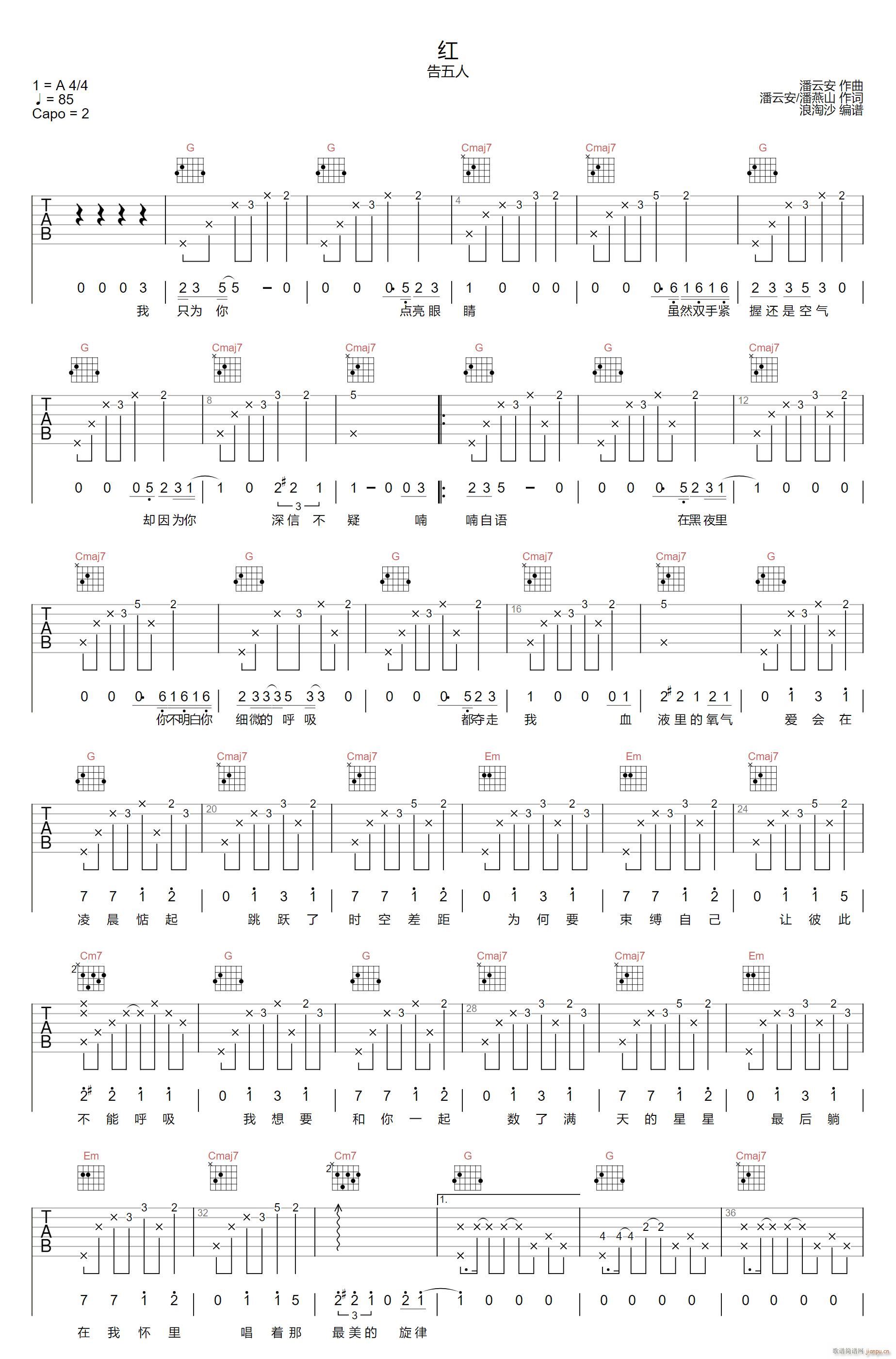 公众号:绵羊乐谱 红 ( G调指法原版编配) 免费弹唱吉他谱_六线谱/词曲:告五人 点击: (浪淘沙) 公众号:绵羊乐谱 | 官方QQ群:978773290 不吃独食,学会分享!本文链接:http://www.shaomingyang.com/btb/32789.html 转载请标明出处,尊重原创(๑╹◡╹)ノ。如信息有误或版权疑问,请通过网站底部联系我们会第一时间处理,感谢理解支持(◕ᴗ◕✿)!