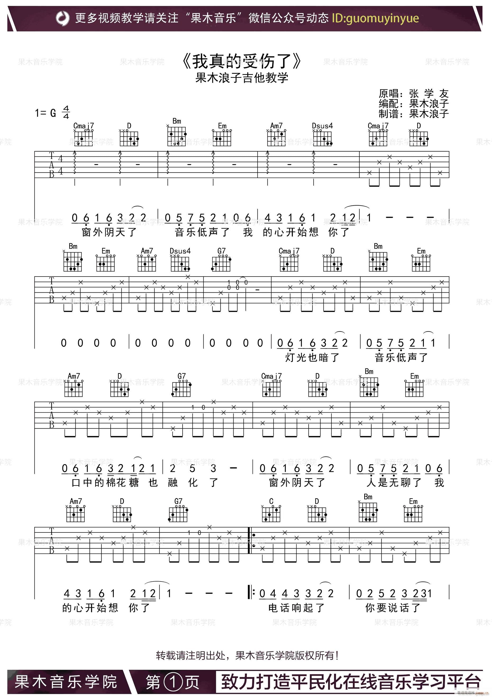 公众号:绵羊乐谱 我真的受伤了 ( G调原版编配) 免费弹唱吉他谱_六线谱/词曲:张学友 点击: (果木浪子) 公众号:绵羊乐谱 | 官方QQ群:978773290 不吃独食,学会分享!本文链接:http://www.shaomingyang.com/btb/32815.html 转载请标明出处,尊重原创(๑╹◡╹)ノ。如信息有误或版权疑问,请通过网站底部联系我们会第一时间处理,感谢理解支持(◕ᴗ◕✿)!