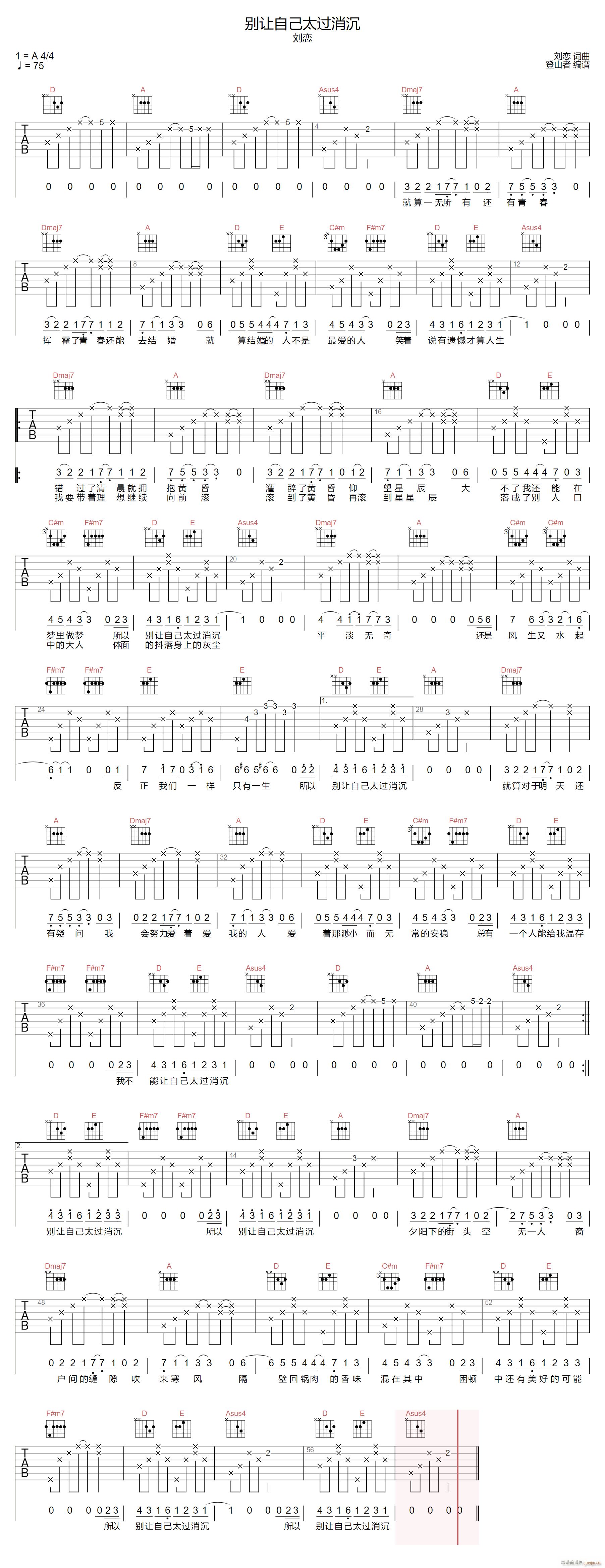公众号:绵羊乐谱 别让自己太过消沉 ( A调原版编配) 免费弹唱吉他谱_六线谱/词曲:刘恋 点击: (登山者) 公众号:绵羊乐谱 | 官方QQ群:978773290 不吃独食,学会分享!本文链接:http://www.shaomingyang.com/btb/32935.html 转载请标明出处,尊重原创(๑╹◡╹)ノ。如信息有误或版权疑问,请通过网站底部联系我们会第一时间处理,感谢理解支持(◕ᴗ◕✿)!