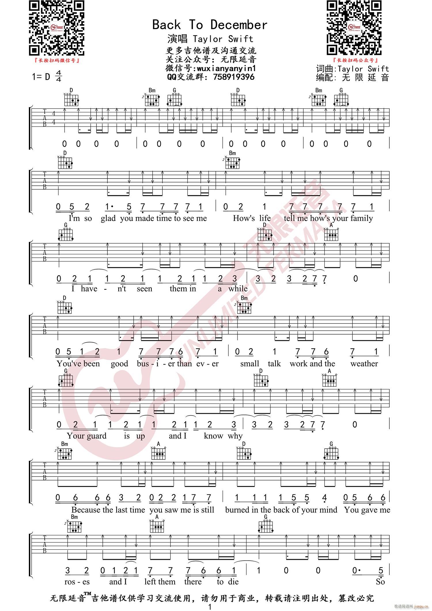 公众号:绵羊乐谱 Back-To-December 免费弹唱吉他谱_六线谱/词曲:Taylor Swift 点击: (无限延音) 公众号:绵羊乐谱 | 官方QQ群:978773290 不吃独食,学会分享!本文链接:http://www.shaomingyang.com/btb/32944.html 转载请标明出处,尊重原创(๑╹◡╹)ノ。如信息有误或版权疑问,请通过网站底部联系我们会第一时间处理,感谢理解支持(◕ᴗ◕✿)!