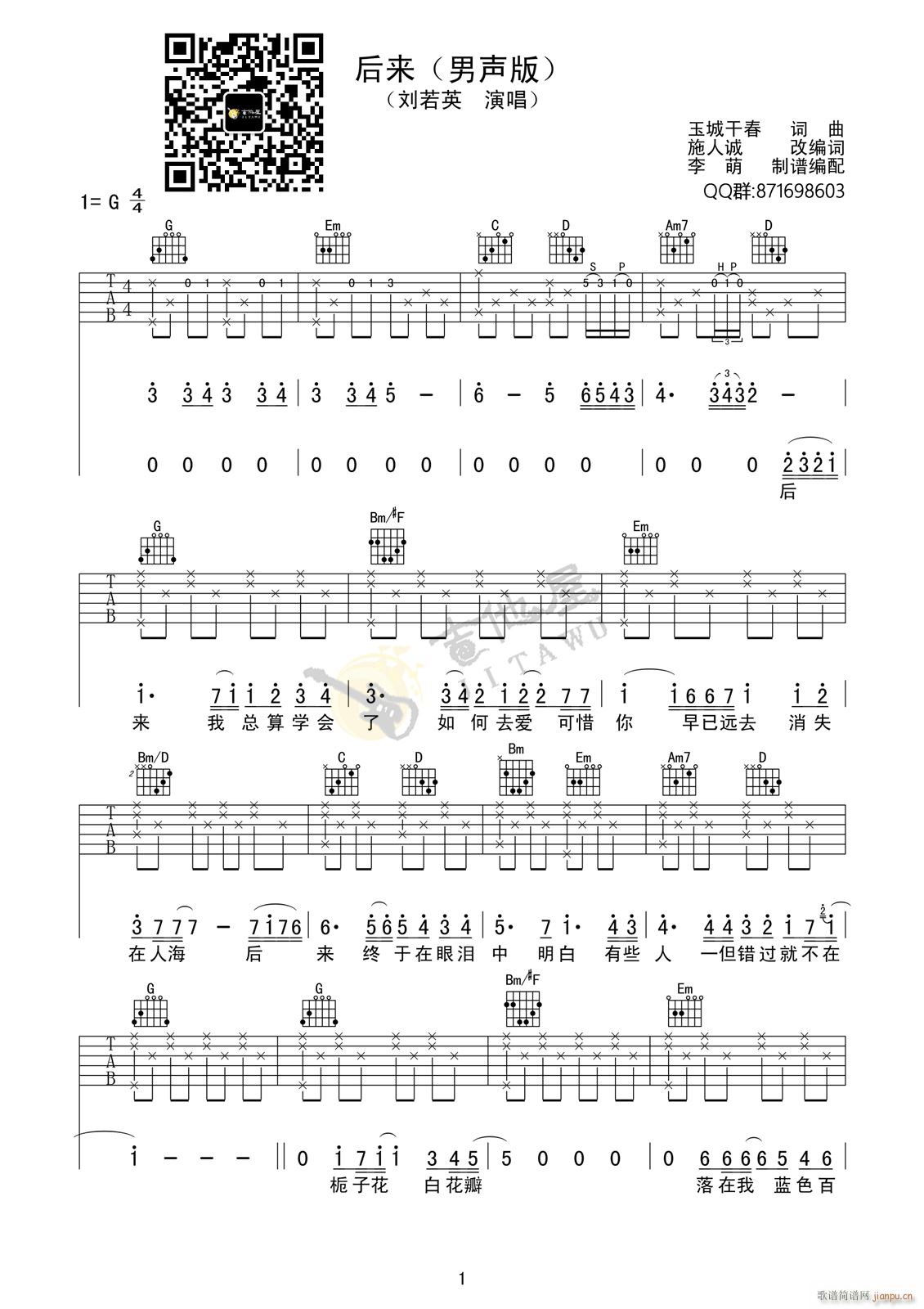 公众号:绵羊乐谱 后来 ( G调指法男生版) 免费弹唱吉他谱_六线谱/词曲:刘若英 点击: (网络) 公众号:绵羊乐谱 | 官方QQ群:978773290 不吃独食,学会分享!本文链接:http://www.shaomingyang.com/btb/32954.html 转载请标明出处,尊重原创(๑╹◡╹)ノ。如信息有误或版权疑问,请通过网站底部联系我们会第一时间处理,感谢理解支持(◕ᴗ◕✿)!