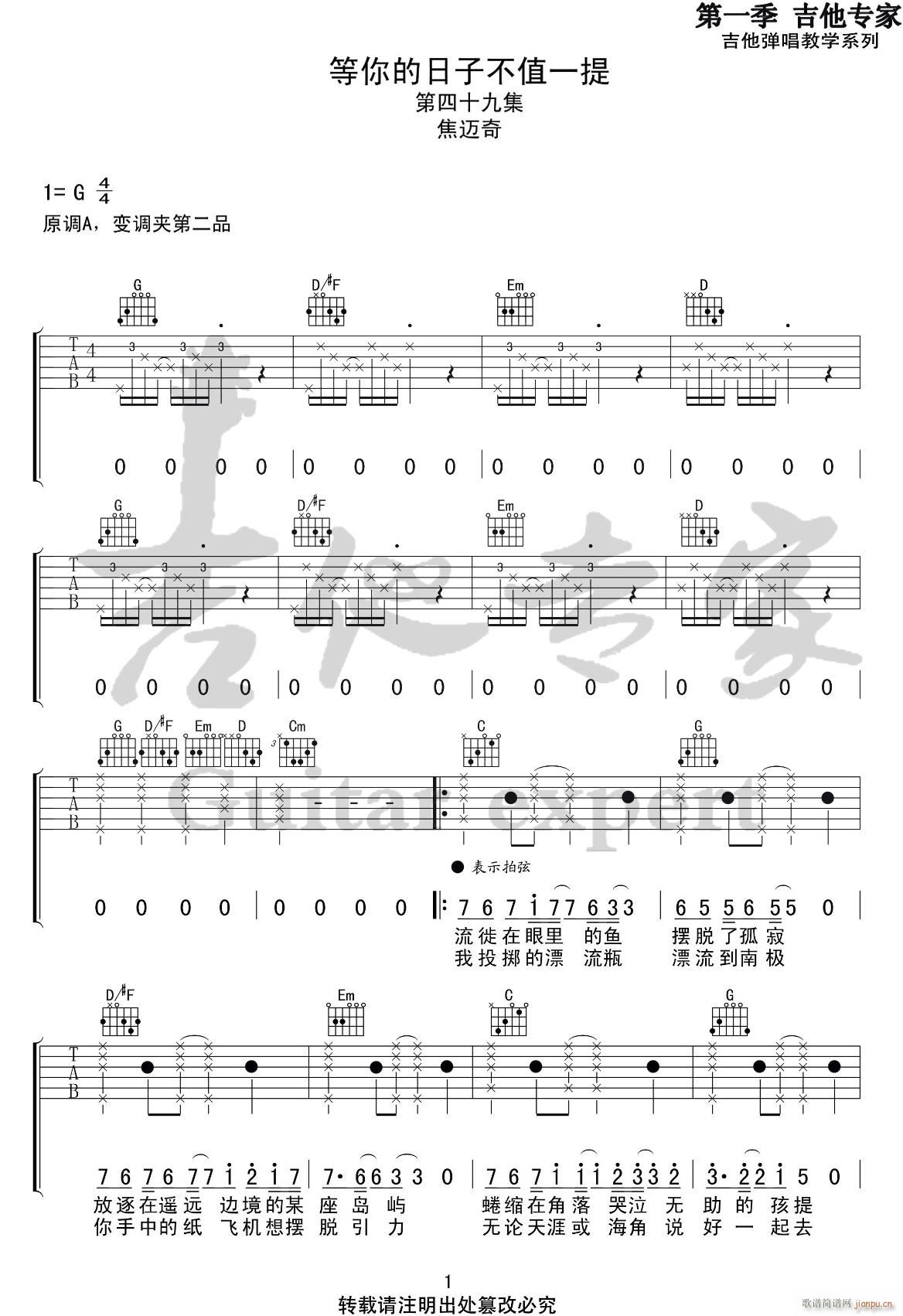 公众号:绵羊乐谱 等你的日子不值一提 ( G调原版) 免费弹唱吉他谱_六线谱/词曲:焦迈奇 点击: (吉他专家) 公众号:绵羊乐谱 | 官方QQ群:978773290 不吃独食,学会分享!本文链接:http://www.shaomingyang.com/btb/32966.html 转载请标明出处,尊重原创(๑╹◡╹)ノ。如信息有误或版权疑问,请通过网站底部联系我们会第一时间处理,感谢理解支持(◕ᴗ◕✿)!