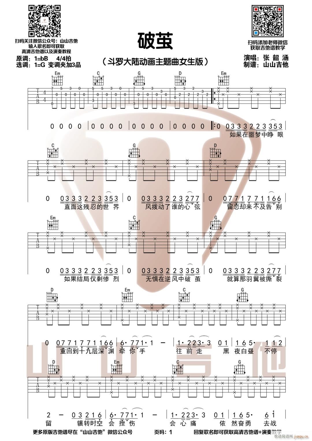 公众号:绵羊乐谱 破茧 ( G调指法原版编配) 免费弹唱吉他谱_六线谱/词曲:张韶涵 点击: (山山吉他) 公众号:绵羊乐谱 | 官方QQ群:978773290 不吃独食,学会分享!本文链接:http://www.shaomingyang.com/btb/33042.html 转载请标明出处,尊重原创(๑╹◡╹)ノ。如信息有误或版权疑问,请通过网站底部联系我们会第一时间处理,感谢理解支持(◕ᴗ◕✿)!