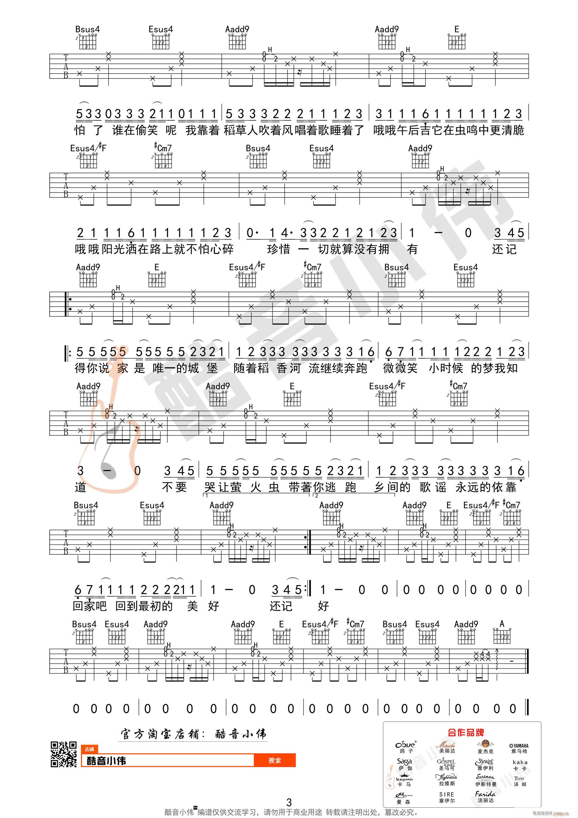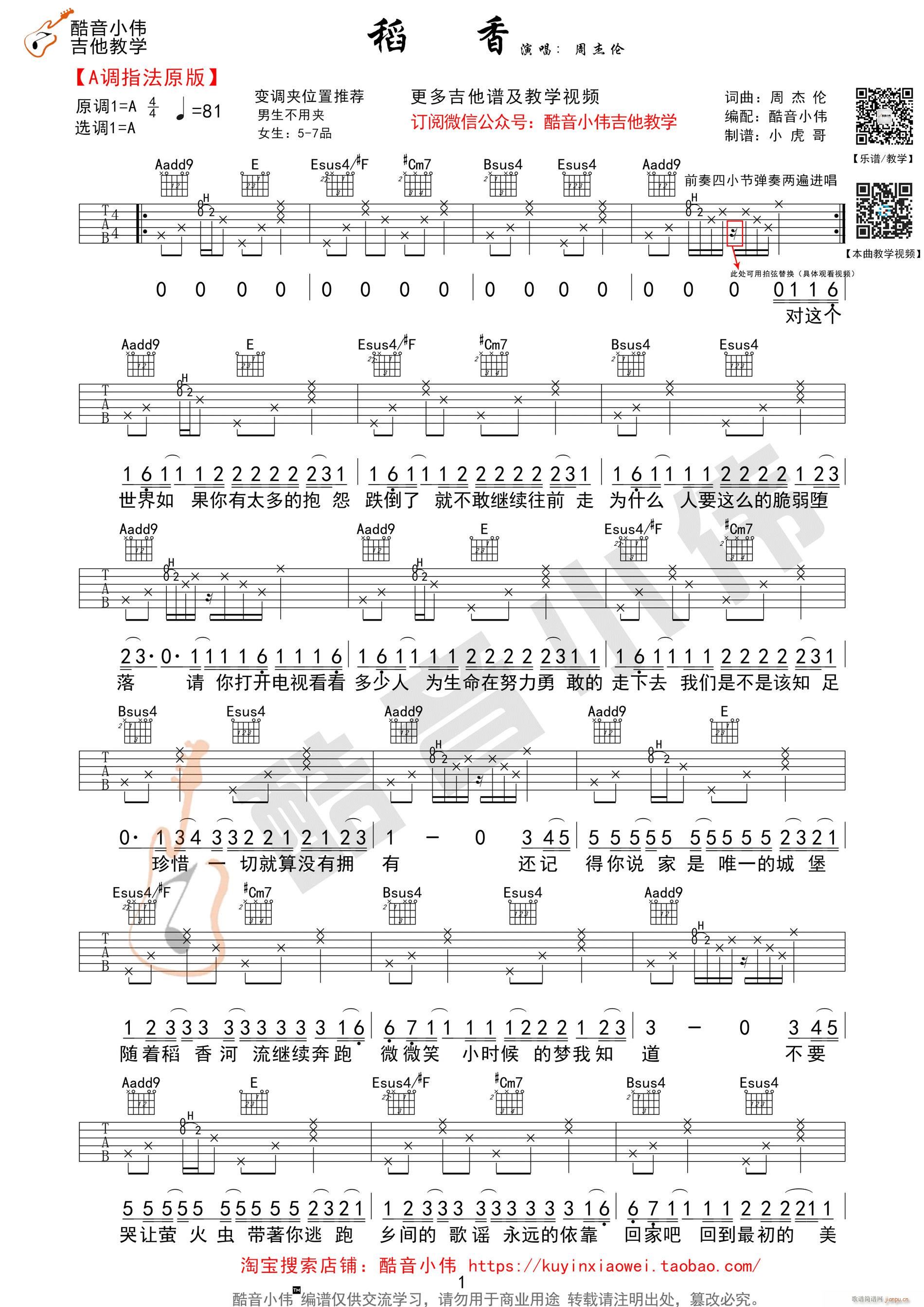 公众号:绵羊乐谱 《稻香》A调原版 ( 吉他教学)免费弹唱吉他谱_六线谱/词曲:周杰伦 点击: 1000 图片可能经过缩放,手机长按或点开后长按保存,电脑鼠标右键保存. (酷音小伟) 公众号:绵羊乐谱 | 官方QQ群:978773290 不吃独食,学会分享!本文链接:http://www.shaomingyang.com/btb/33047.html 转载请标明出处,尊重原创(๑╹◡╹)ノ。如信息有误或版权疑问,请通过网站底部联系我们会第一时间处理,感谢理解支持(◕ᴗ◕✿)!