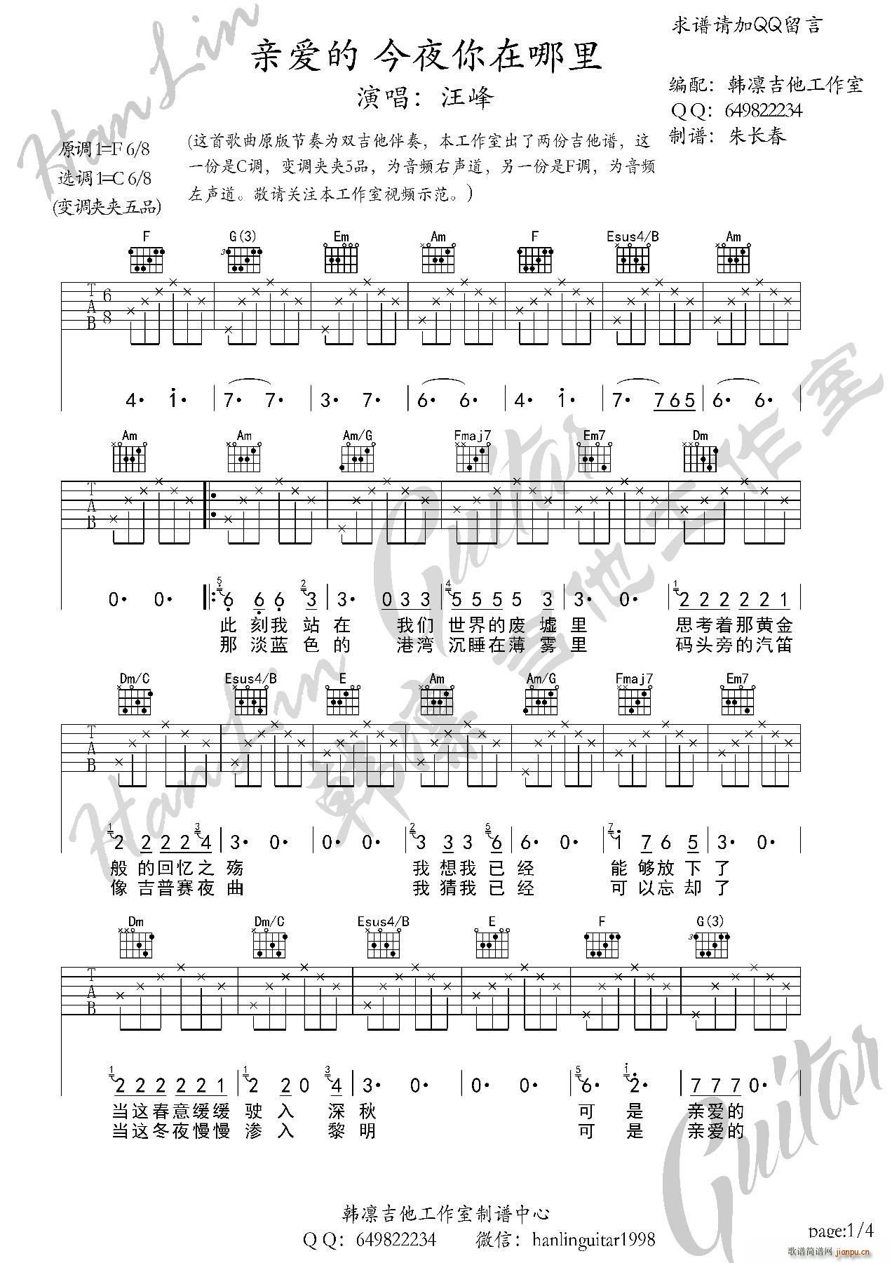 公众号:绵羊乐谱 亲爱的今夜你在哪里 C调 韩凛吉他工作室(韩凛原版编配)免费弹唱吉他谱_六线谱/词曲:汪峰汪峰点击: 1000 图片可能经过缩放,手机长按或点开后长按保存,电脑鼠标右键保存. (韩艺文) 公众号:绵羊乐谱 | 官方QQ群:978773290 不吃独食,学会分享!本文链接:http://www.shaomingyang.com/btb/33133.html 转载请标明出处,尊重原创(๑╹◡╹)ノ。如信息有误或版权疑问,请通过网站底部联系我们会第一时间处理,感谢理解支持(◕ᴗ◕✿)!