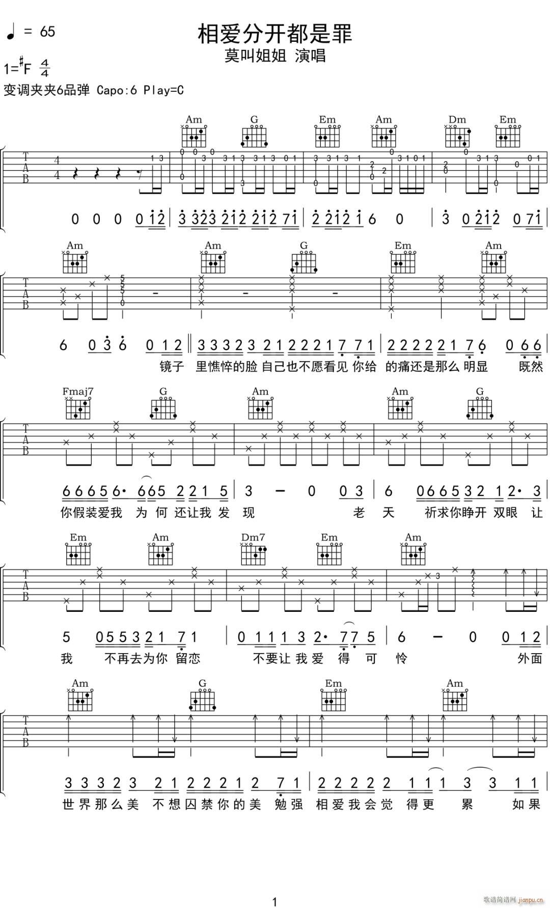 公众号:绵羊乐谱 相爱分开都是罪 ( C调原版) 免费弹唱吉他谱_六线谱/词曲:莫叫姐姐 点击: (网络) 公众号:绵羊乐谱 | 官方QQ群:978773290 不吃独食,学会分享!本文链接:http://www.shaomingyang.com/btb/33141.html 转载请标明出处,尊重原创(๑╹◡╹)ノ。如信息有误或版权疑问,请通过网站底部联系我们会第一时间处理,感谢理解支持(◕ᴗ◕✿)!