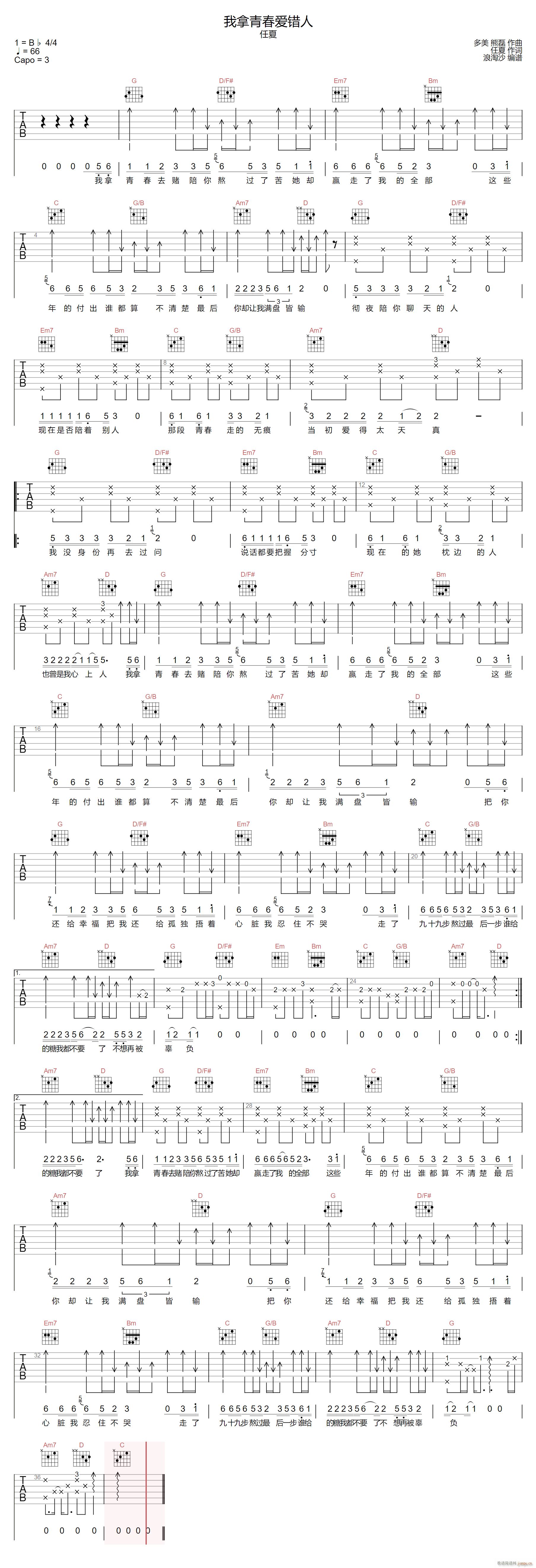 公众号:绵羊乐谱 我拿青春爱错人 ( G调指法编配) 免费弹唱吉他谱_六线谱/词曲:任夏 点击: (浪淘沙) 公众号:绵羊乐谱 | 官方QQ群:978773290 不吃独食,学会分享!本文链接:http://www.shaomingyang.com/btb/33264.html 转载请标明出处,尊重原创(๑╹◡╹)ノ。如信息有误或版权疑问,请通过网站底部联系我们会第一时间处理,感谢理解支持(◕ᴗ◕✿)!