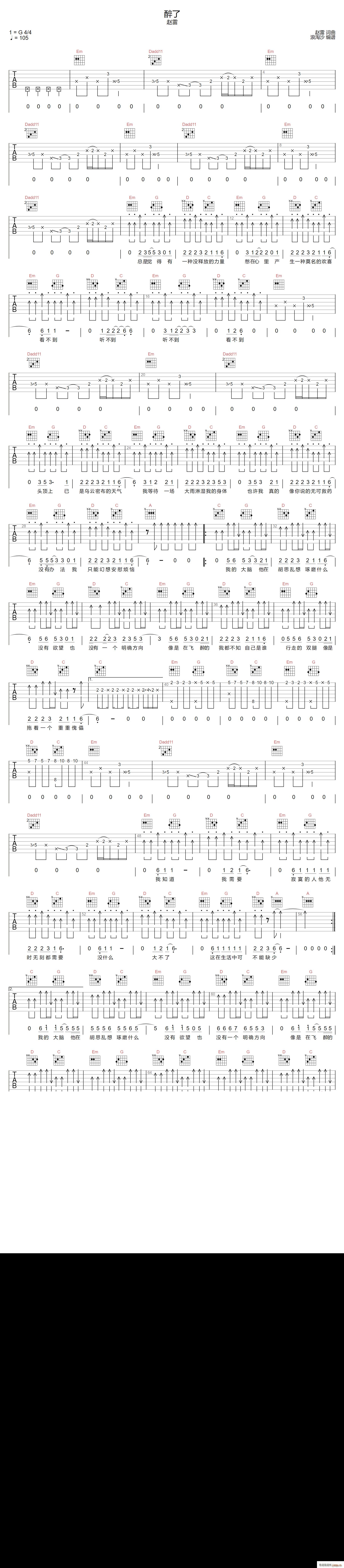 公众号:绵羊乐谱 醉了 ( G调指法原版编配) 免费弹唱吉他谱_六线谱/词曲:赵雷 点击: (浪淘沙) 公众号:绵羊乐谱 | 官方QQ群:978773290 不吃独食,学会分享!本文链接:http://www.shaomingyang.com/btb/33266.html 转载请标明出处,尊重原创(๑╹◡╹)ノ。如信息有误或版权疑问,请通过网站底部联系我们会第一时间处理,感谢理解支持(◕ᴗ◕✿)!
