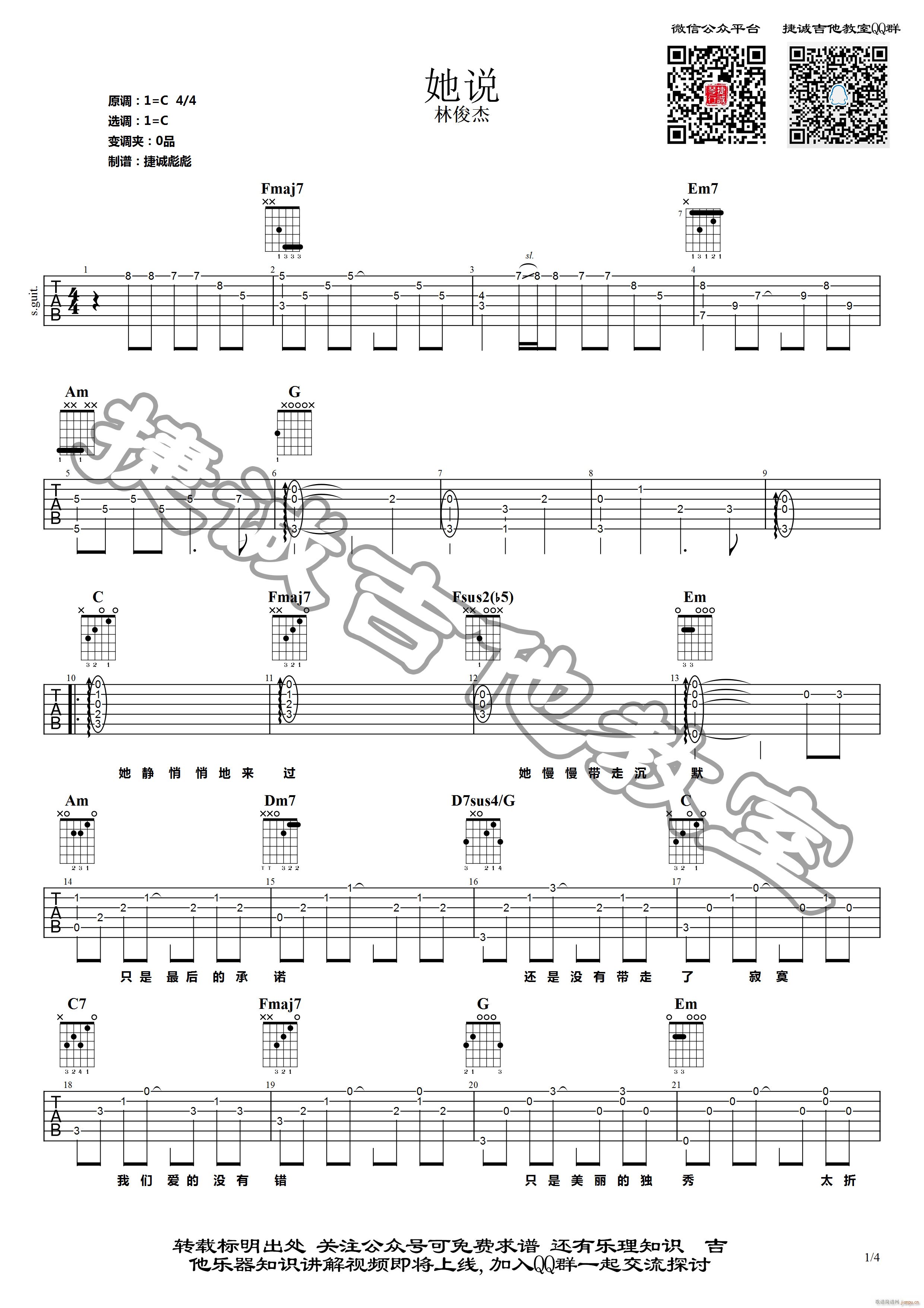 公众号:绵羊乐谱 她说 ( C调原版编配) 免费弹唱吉他谱_六线谱/词曲:林俊杰 点击: (捷诚吉他教室) 公众号:绵羊乐谱 | 官方QQ群:978773290 不吃独食,学会分享!本文链接:http://www.shaomingyang.com/btb/33270.html 转载请标明出处,尊重原创(๑╹◡╹)ノ。如信息有误或版权疑问,请通过网站底部联系我们会第一时间处理,感谢理解支持(◕ᴗ◕✿)!