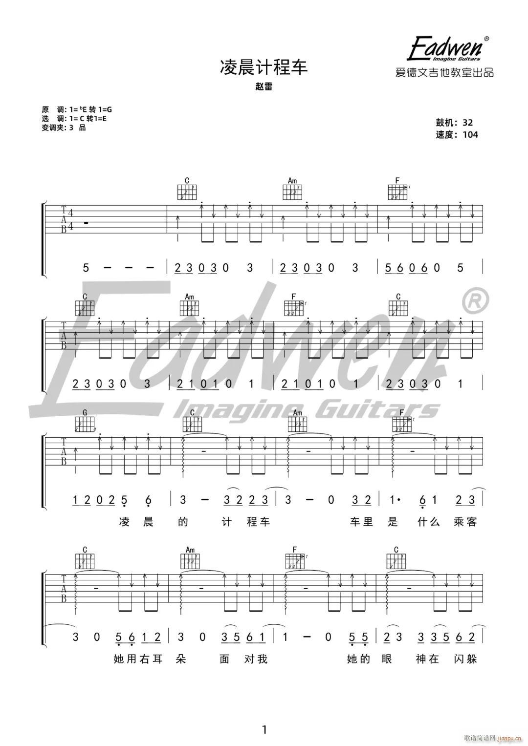 公众号:绵羊乐谱 凌晨计程车 ( C调切弦版) 免费弹唱吉他谱_六线谱/词曲:赵雷 点击: (爱德文吉他教室) 公众号:绵羊乐谱 | 官方QQ群:978773290 不吃独食,学会分享!本文链接:http://www.shaomingyang.com/btb/33284.html 转载请标明出处,尊重原创(๑╹◡╹)ノ。如信息有误或版权疑问,请通过网站底部联系我们会第一时间处理,感谢理解支持(◕ᴗ◕✿)!