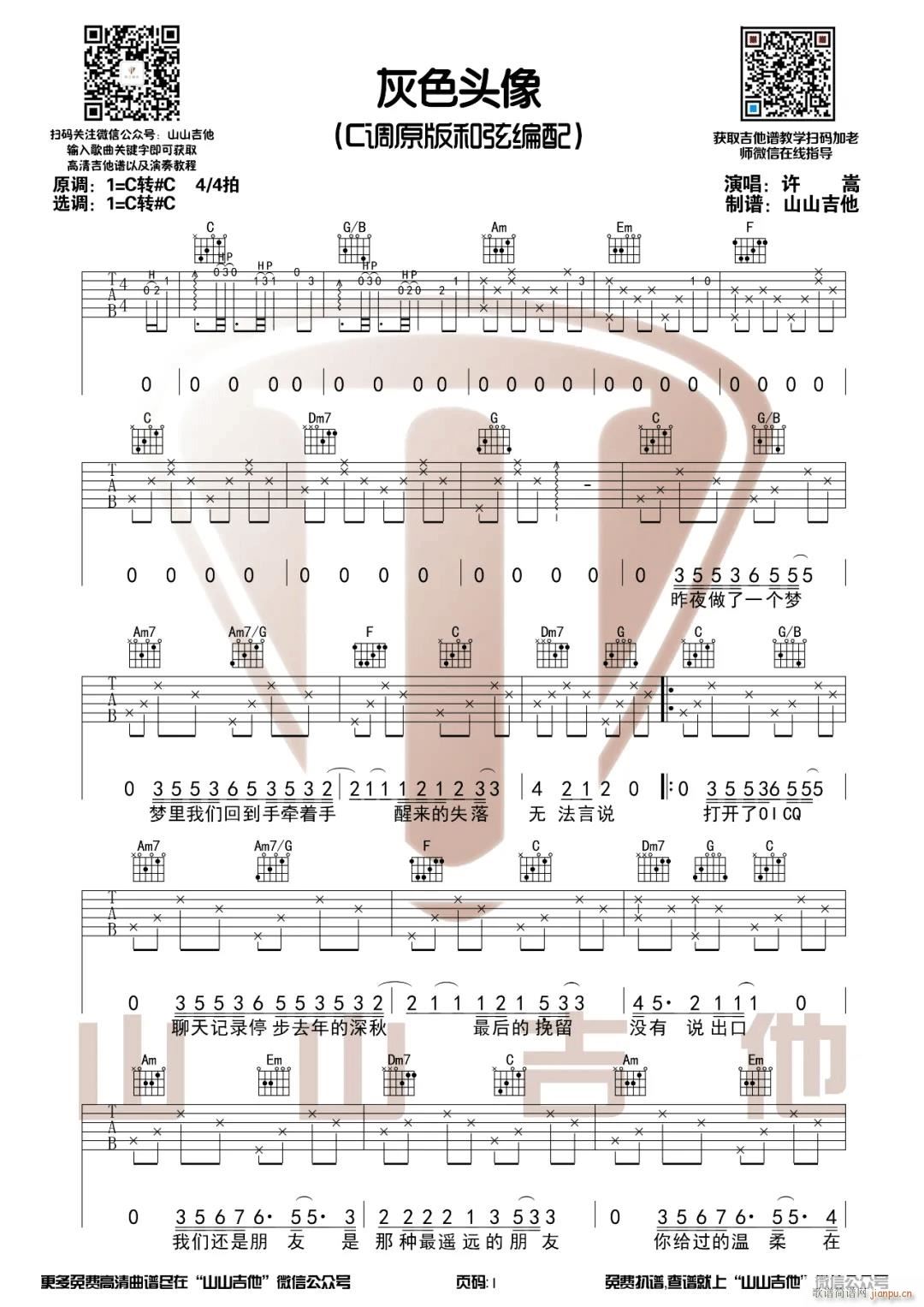 公众号:绵羊乐谱 灰色头像 ( C调指法原版编配) 免费弹唱吉他谱_六线谱/词曲:许嵩 点击: (山山吉他) 公众号:绵羊乐谱 | 官方QQ群:978773290 不吃独食,学会分享!本文链接:http://www.shaomingyang.com/btb/33293.html 转载请标明出处,尊重原创(๑╹◡╹)ノ。如信息有误或版权疑问,请通过网站底部联系我们会第一时间处理,感谢理解支持(◕ᴗ◕✿)!