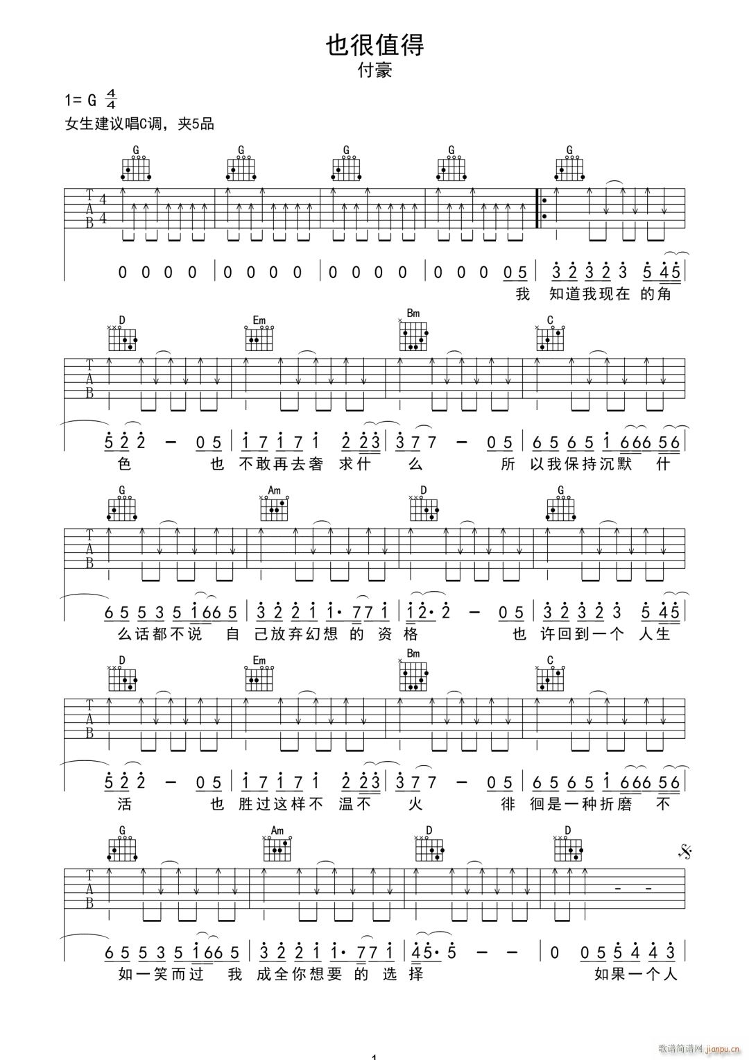 公众号:绵羊乐谱 也很值得 ( G调指法扫弦版) 免费弹唱吉他谱_六线谱/词曲:付豪 点击: (网络) 公众号:绵羊乐谱 | 官方QQ群:978773290 不吃独食,学会分享!本文链接:http://www.shaomingyang.com/btb/33422.html 转载请标明出处,尊重原创(๑╹◡╹)ノ。如信息有误或版权疑问,请通过网站底部联系我们会第一时间处理,感谢理解支持(◕ᴗ◕✿)!