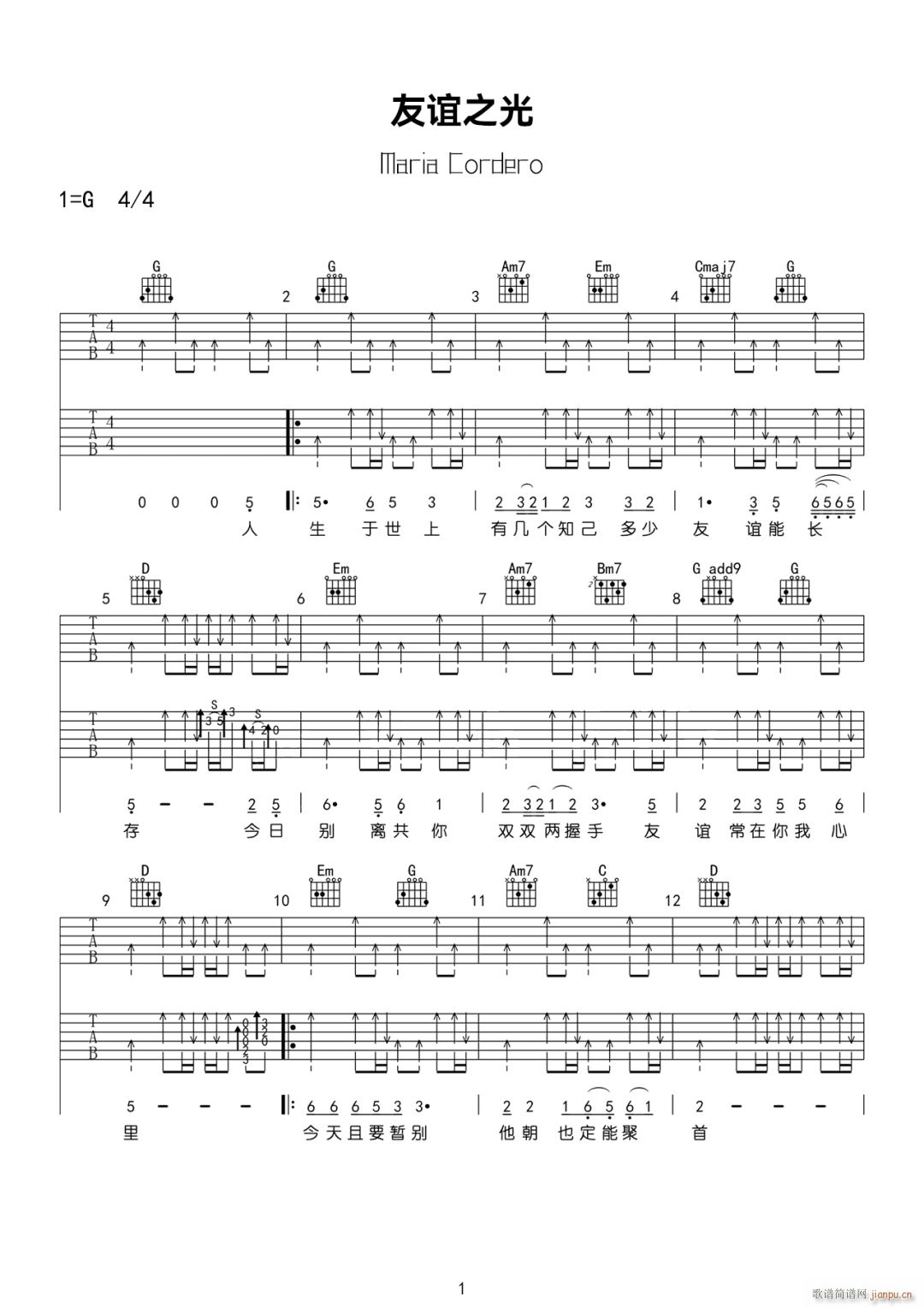 公众号:绵羊乐谱 友谊之光 ( G调原版) 免费弹唱吉他谱_六线谱/词曲:Maria Cordero 点击: (网络) 公众号:绵羊乐谱 | 官方QQ群:978773290 不吃独食,学会分享!本文链接:http://www.shaomingyang.com/btb/33750.html 转载请标明出处,尊重原创(๑╹◡╹)ノ。如信息有误或版权疑问,请通过网站底部联系我们会第一时间处理,感谢理解支持(◕ᴗ◕✿)!